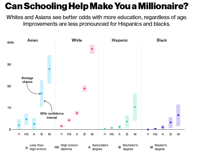 Xác suất để một người da đen trở thành triệu phú dao động từ dưới 1% nếu người này chưa tốt nghiệp cấp 3 và lên đến 6,7% nếu đã tốt nghiệp đại học. Trong khi đó, người Mỹ da trắng chưa tốt nghiệp trung học khởi đầu với cơ hội tốt hơn (1,7%). Trình độ học vấn càng cao, họ càng vượt xa những người da đen. Xác suất trở thành triệu phú lên đến 37% nếu họ tốt nghiệp chương trình liên kết.
