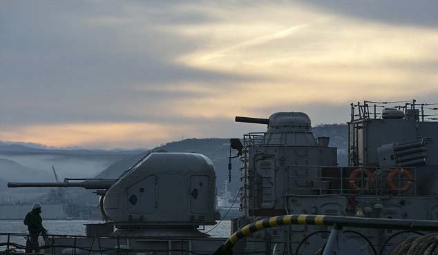 | Sĩ quan hải quân Ukraina đang bảo vệ tàu Ternopil. Nếu hạm đội Biển Đen muốn phong tỏa căn cứ hải quân này, sẽ không tàu chiến nào có cơ hội vượt ra ngoài vì tàu Nga uy lực hơn hẳn so với tàu Ukraina. Ảnh: Reuters. |