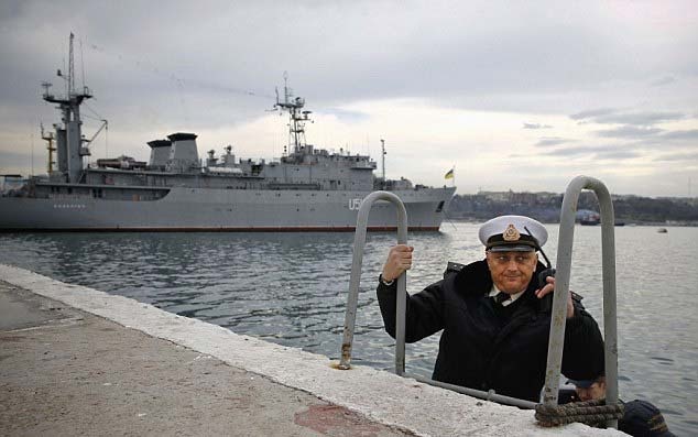 | Sĩ quan Ukraina lên bờ từ tàu Slavutich. Tàu của ông đang bị chiến hạm Nga án ngữ lối ra biển. Ở một diễn biến khác, theo Ibtimes của Mỹ, chính quyền Tổng thống Obama đã điều quân lực và 12 máy bay F-16 tới Ba Lan để tập trận tuần tới sau khi Nga "đưa quân vào vùng lãnh thổ tự trị Crimea". Ảnh: Reuters. |