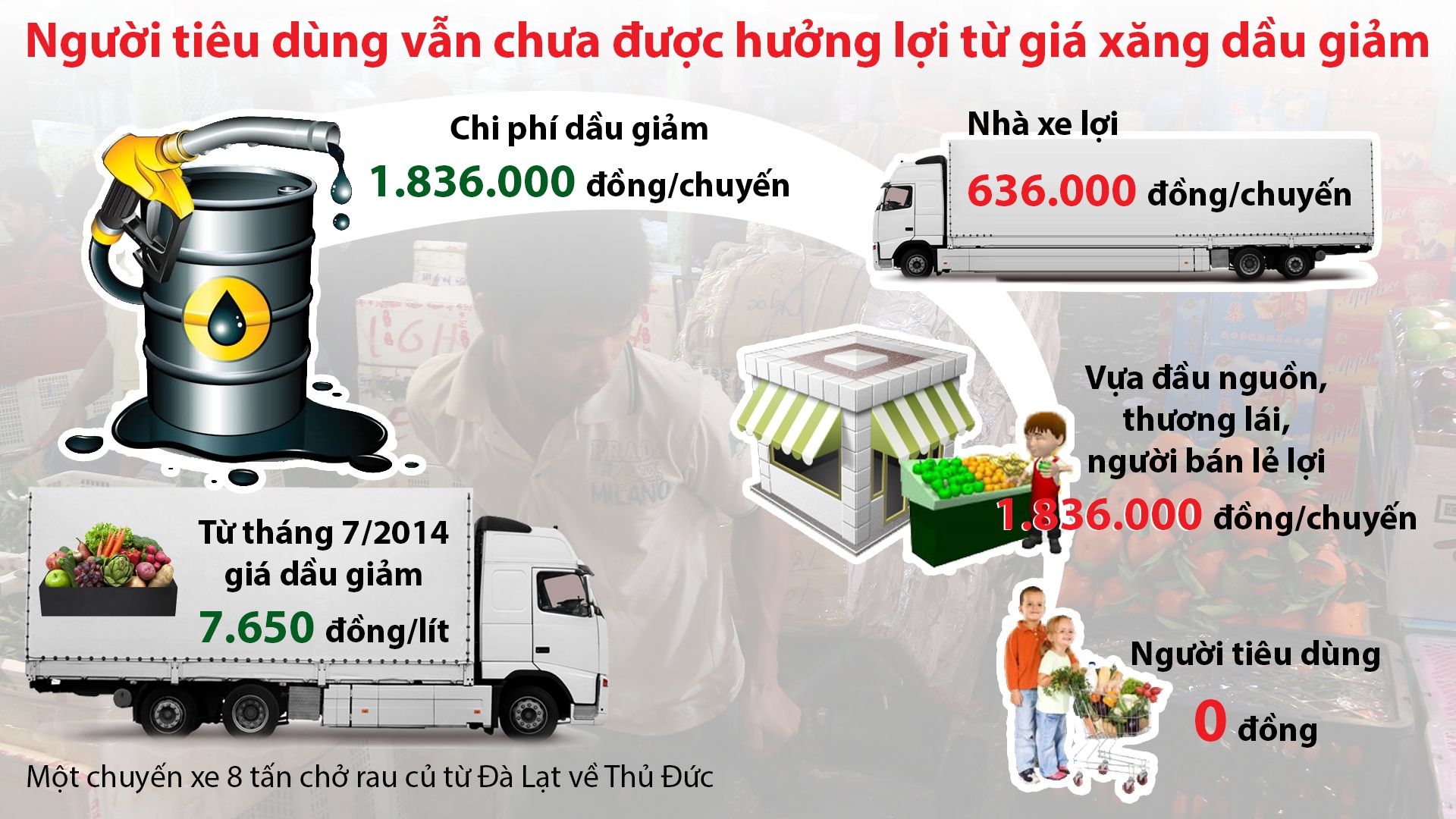 Lấy một ví dụ phổ biến khác với xe chở rau củ quả từ Ðà Lạt xuống Thủ Ðức. Hồi tháng 7, cước một chuyến xe chở khoai tây là 650.000 đồng/tấn. Hiện tại, con số này đã được nhà xe giảm còn khoảng 500.000 đồng/tấn. Giá cước đã giảm trong khi giá bán ra cho người tiêu dùng không đổi, tính ra thương lái và nhà bán lẻ hưởng lợi từ việc xăng giảm được 150.000 đồng/tấn. Xe 8 tấn, họ hưởng lợi 1.200.000 đồng/chuyến.