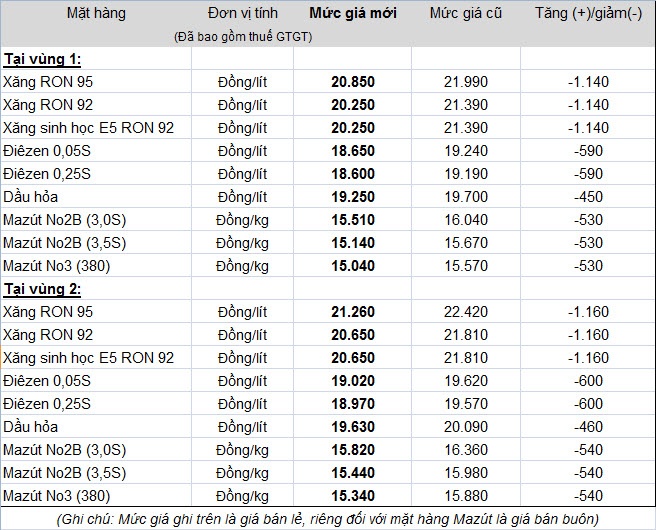 Theo thông tin từ liên bộ Tài chính - Công thương, kể từ 11h trưa ngày 22/11, giá các mặt hàng xăng trong nước sẽ được điều chỉnh giảm ít nhất 1.141 đồng/lít, dầu diesel giảm 590 đồng/lít và dầu hỏa giảm 530 đồng/lít. Mức giá mới của xăng RON 92 là 20.250 đồng/lít, dầu điêzen 0,05S là 18.657 đồng/lít, dầu hỏa là 19.250 đồng/lít.
