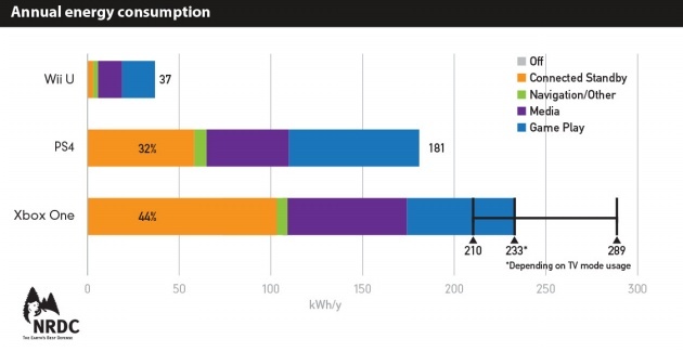 Theo một nghiên cứu mới đây của Hội đồng Bảo vệ Tài nguyên (Natural Resources Defense Council - NRDC), máy chơi game Xbox One của Microsoft có mức tiêu thụ điện lớn ở mức đáng ngại. Console này tiêu thụ tối đa 289 kWh mỗi năm, trong khi con số này của Xbox 360 chỉ là 70 kWh. Wii U của Nintendo cũng được đánh giá cao ở khả năng tiết kiệm điện, tiêu tốn khoảng 37 kWh/năm, thấp hơn con số 40 kWh/năm của Wii.