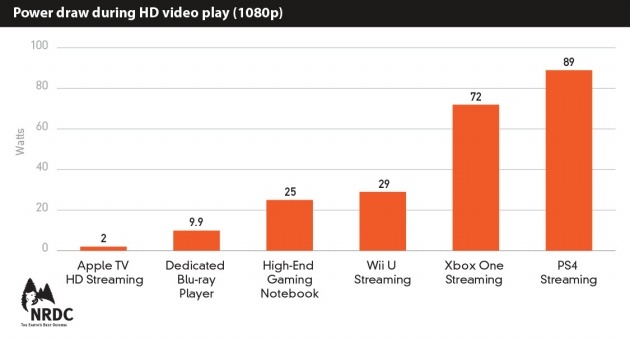 "Hầu hết điện năng tiêu thụ diễn ra vào ban đêm, khi console ở chế độ standby nhưng chúng vẫn ở trại thái sẵn sàng nhận diện giọng nói, như trên Xbox One. Với PS4, console này tiêu tốn quá nhiều điện để giữ cho cổng USB luôn được kích hoạt" - NRDC cho biết. Tổ chức này cũng khuyên người dùng không nên dùng One để xem TV mà chuyển sang Apple TV. Thiết bị của Apple chỉ tiêu tốn 2W điện để stream 1 bộ phim độ phân giải hD, còn con số này trên One là 72W, và trên PS4 là 89W