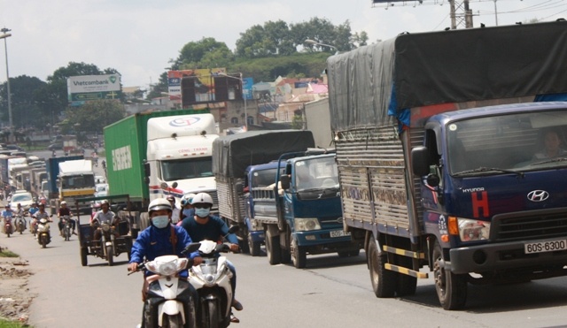| Đoạn đường từ vòng xoay Tam Hiệp đến ngã 4 Amata (TP.Biên Hòa) hàng ngày có rất nhiều xe tải, xe ben và container lưu thông. |