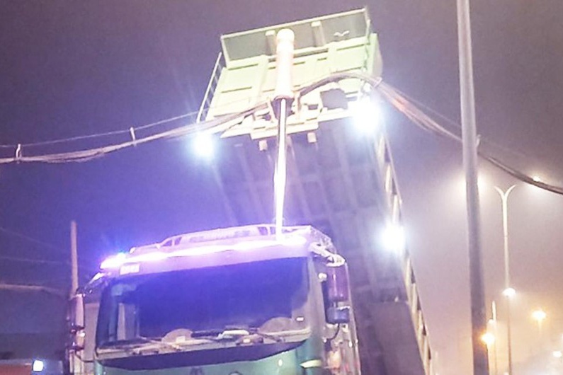 Thùng xe ben vướng vào dây cáp điện trên quốc lộ 1. Ảnh: A.T. |