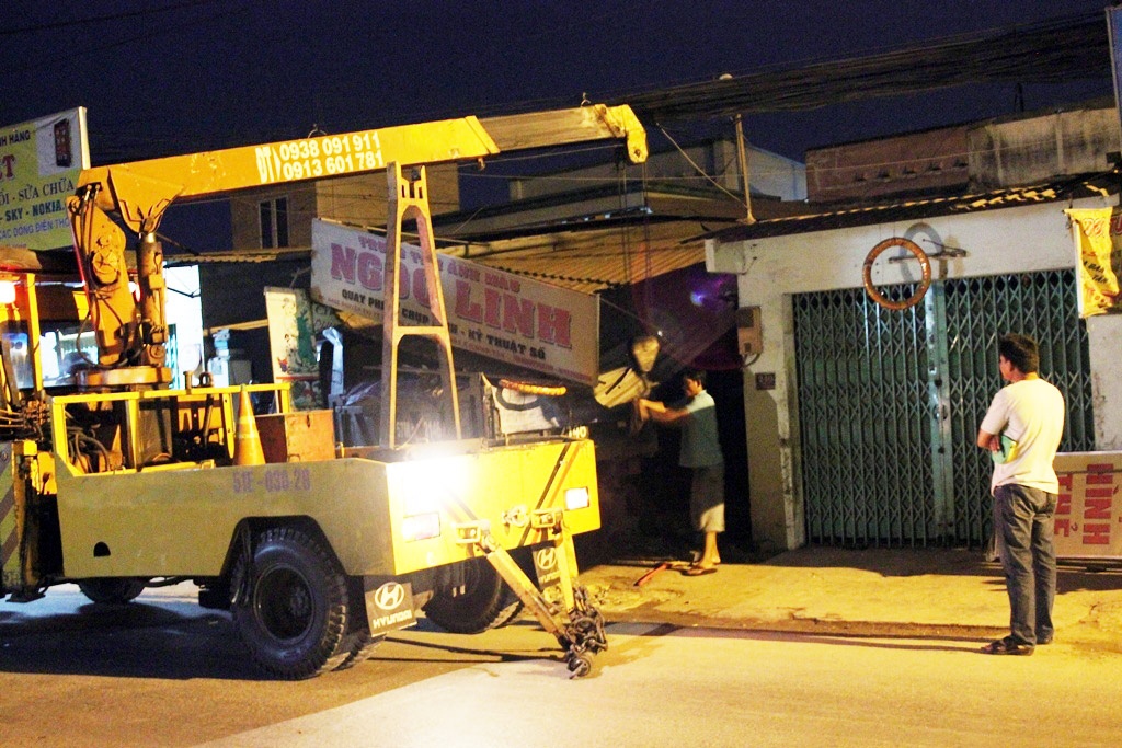 Lúc này, một chiếc xe ben chở vật liệu xây dựng lưu thông từ quốc lộ 1A vào Hương lộ 80 với tốc độ khá nhanh. Khi đến gần tiệm chụp ảnh thì bất ngờ tài xế mất lái, chiếc xe lao thẳng vào ngôi nhà. Do chạy với tốc độ khá cao, chiếc xe tải đã tông văng cánh cửa sắt, làm sập mái của nhà anh Linh.