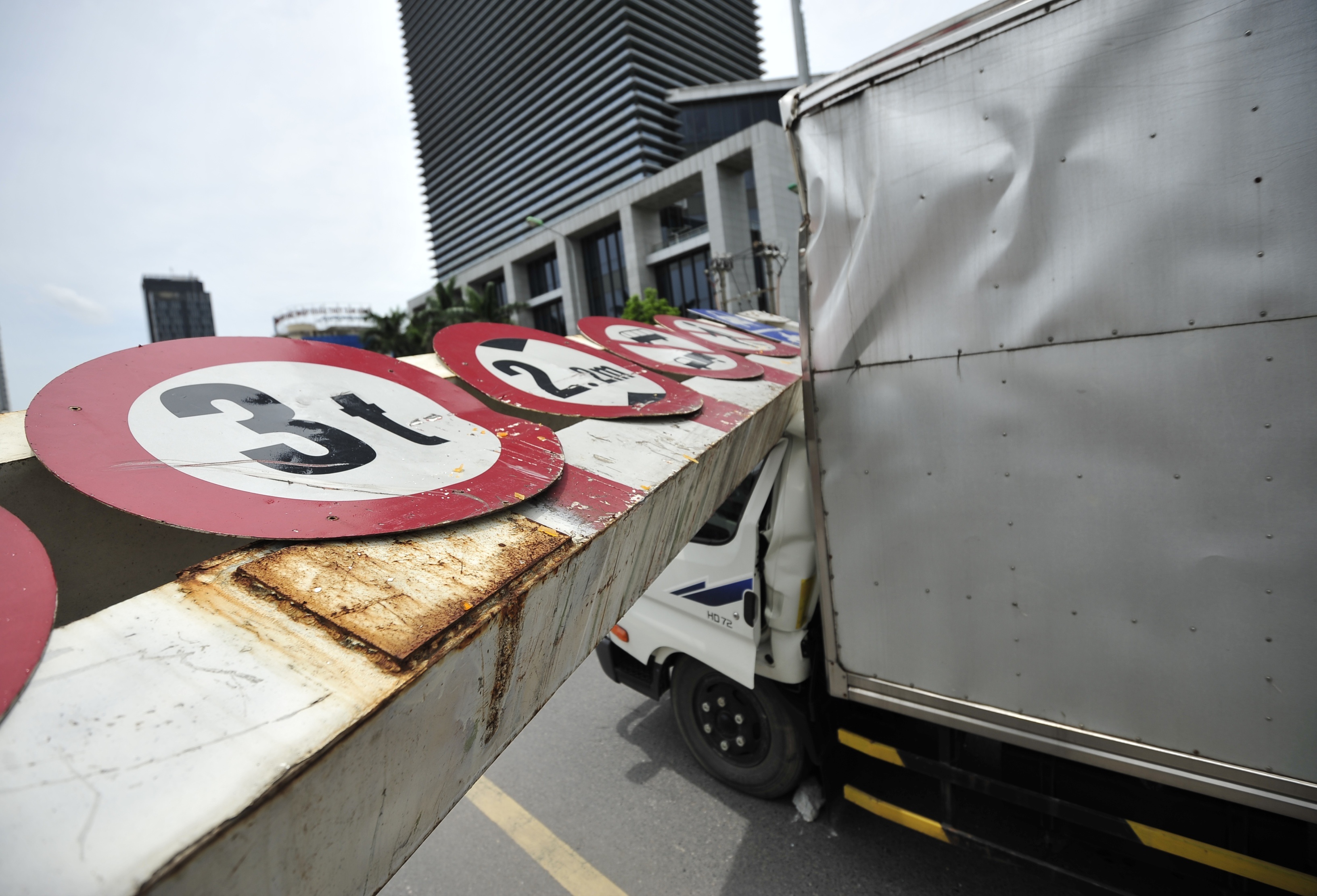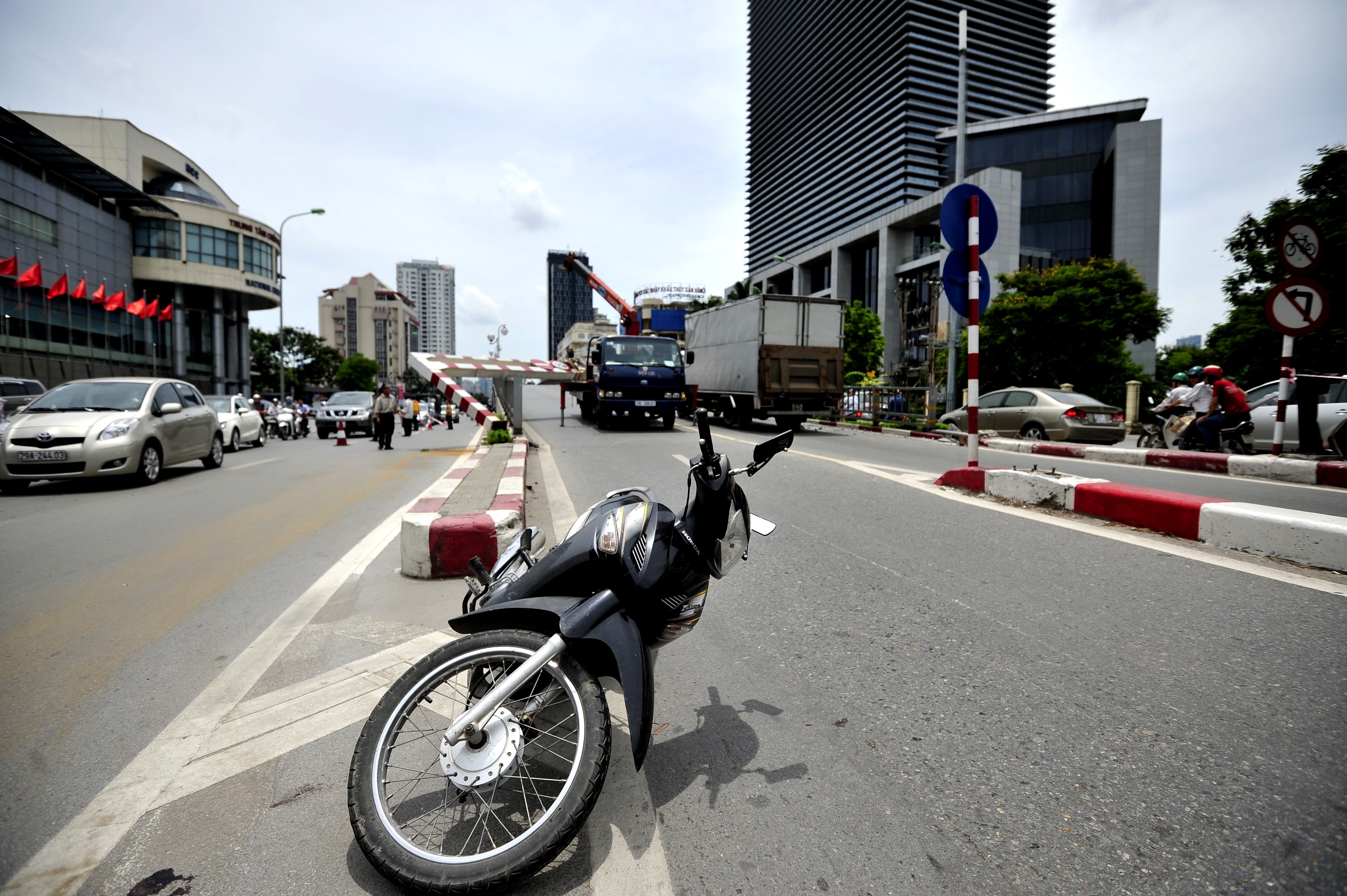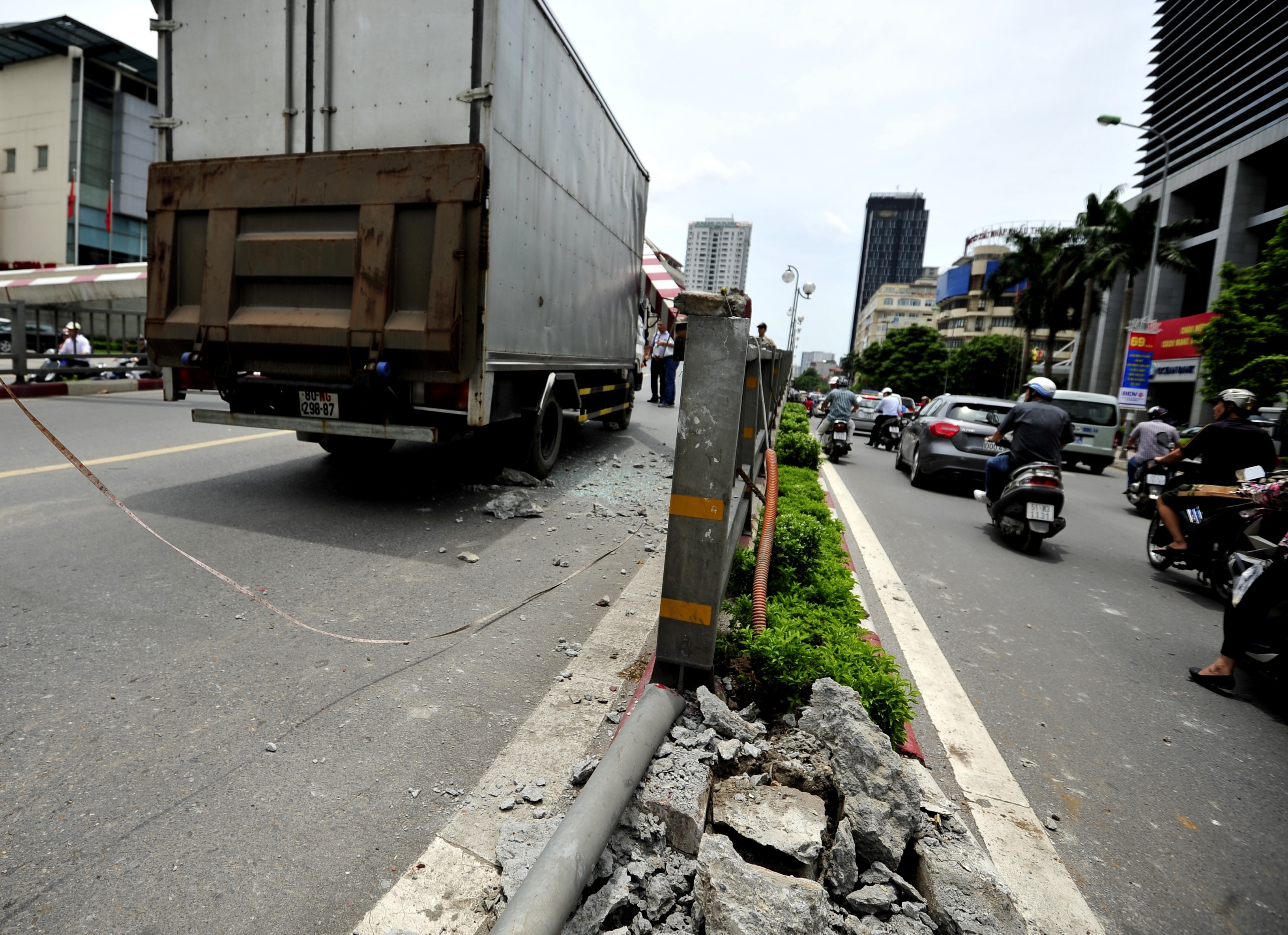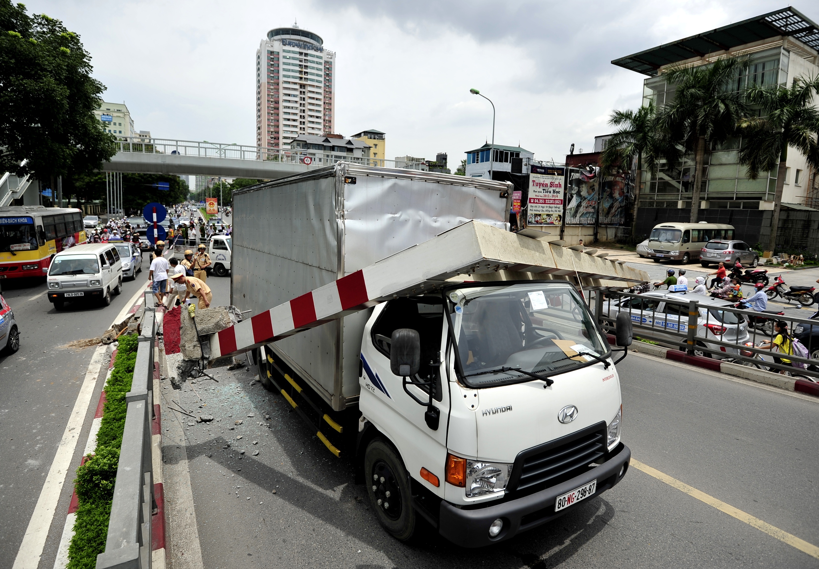 Mặc dù có biển giới hạn chiều cao và tải trọng nhưng chiếc xe tải phục vụ một cơ quan ngoại giao ở Hà Nội vẫn lao lên cầu vượt nhẹ, húc đổ cổng thép rồi tông vào 3 xe máy.