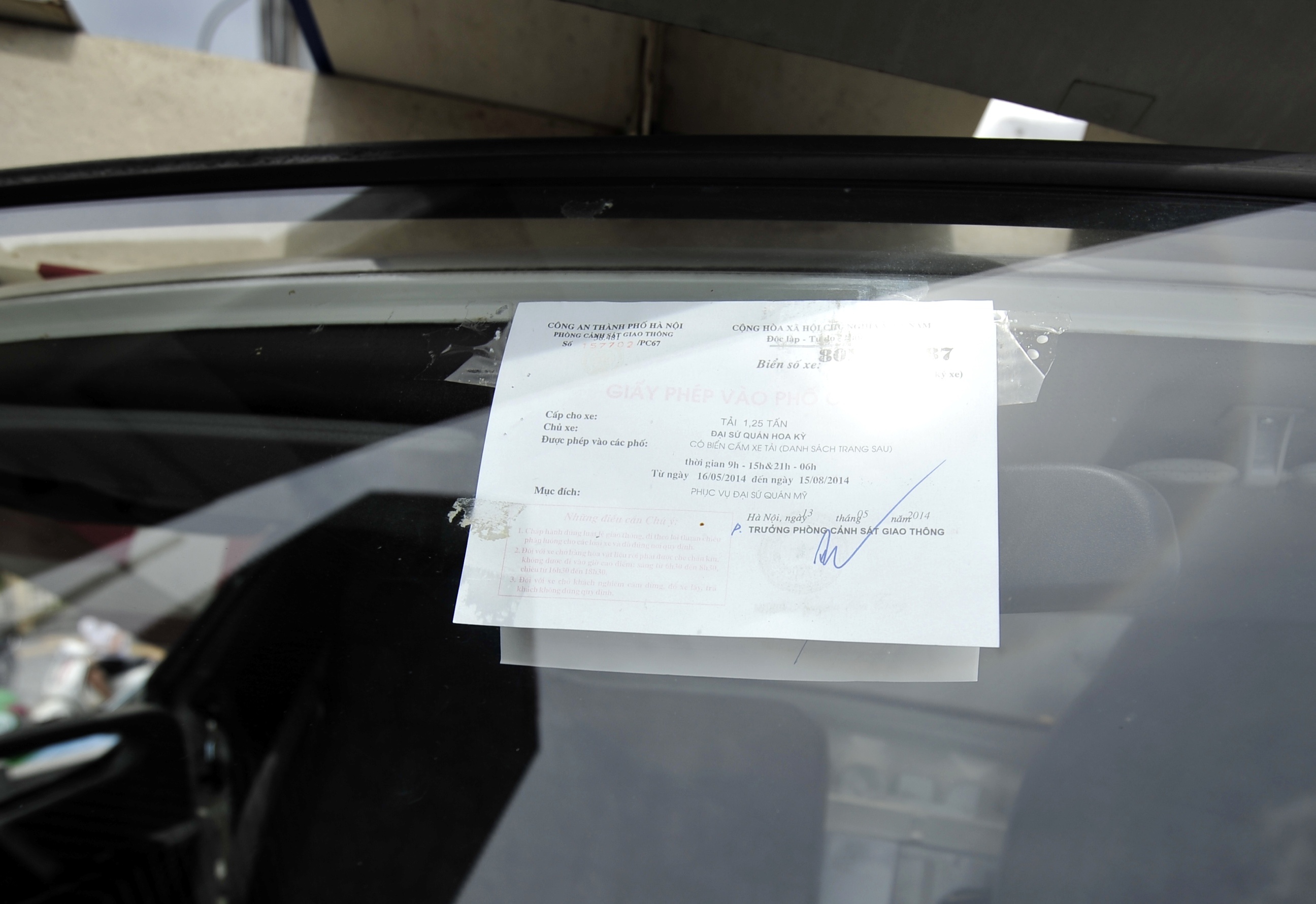 Trong khi đó, theo giấy phép vào phố cấm dán do Phòng CSGT Hà Nội cấp thì đây là loại xe có tải trọng 1,25 tấn; xe được phép vào các phố có biển cấm xe tải từ 9h-15h và 21h-6h từ ngày 16/5 đến hết ngày 15/8/2014.