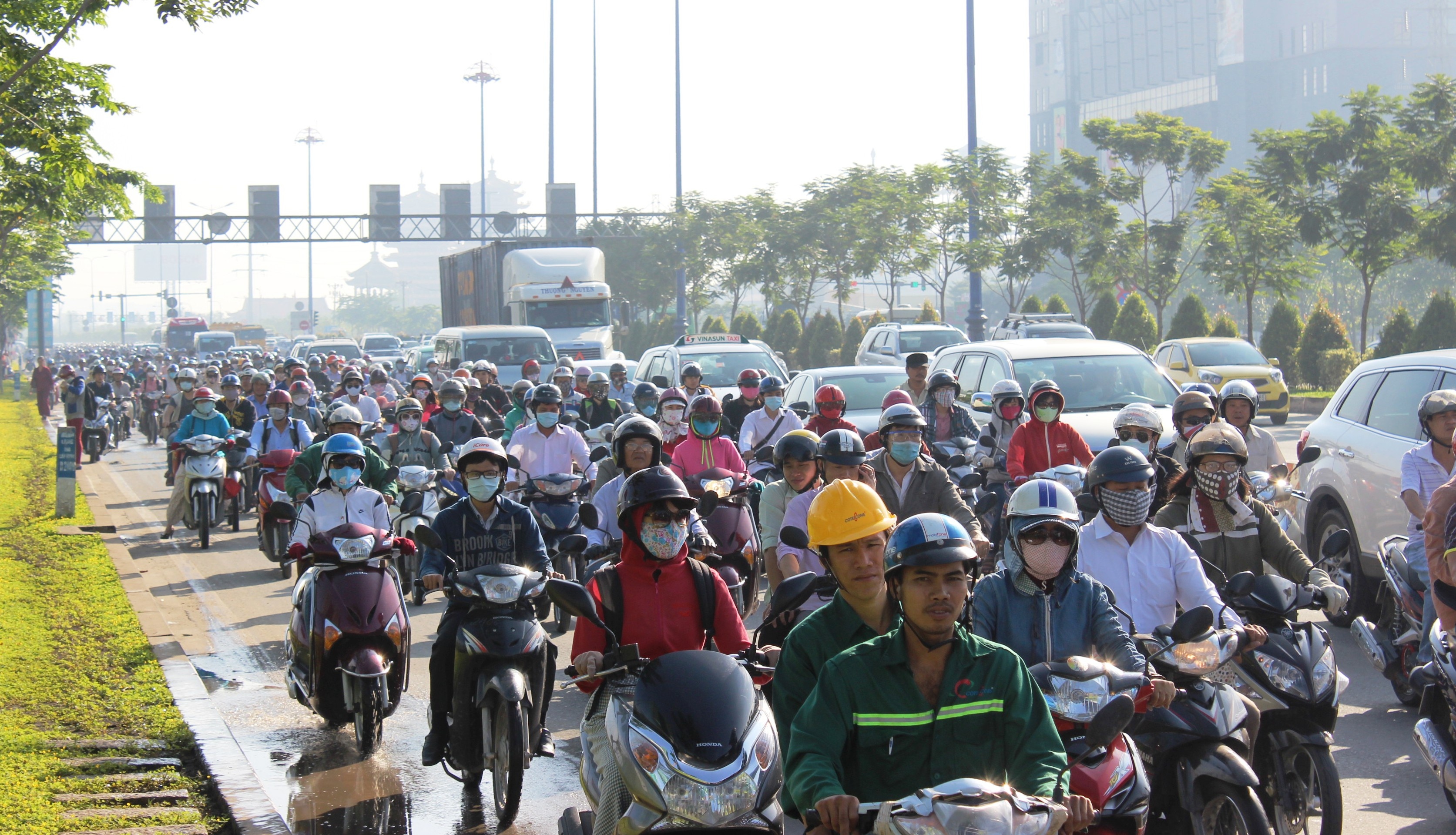 Người dân phản ánh, giờ cao điểm sáng khu vực này thường ùn tắc nghiêm trọng. Để tránh kẹt, hàng trăm xe máy bất chấp nguy hiểm chạy vào làn đường xe ôtô để di chuyển.