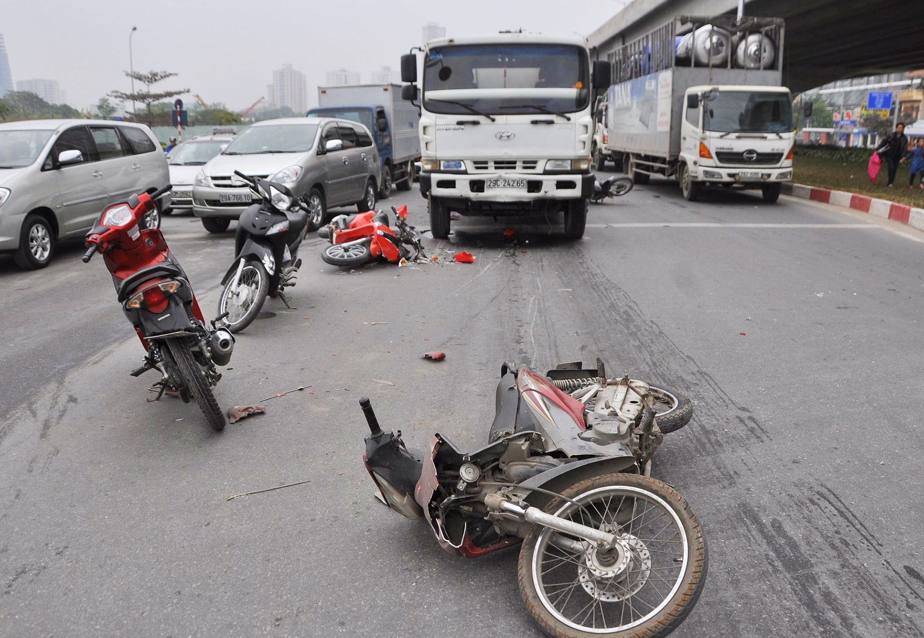 | Hiện trường vụ tai nạn xe bồn chở xăng mất phanh đâm hàng loạt xe máy trên đường Khuất Duy Tiến sáng 4/1. |