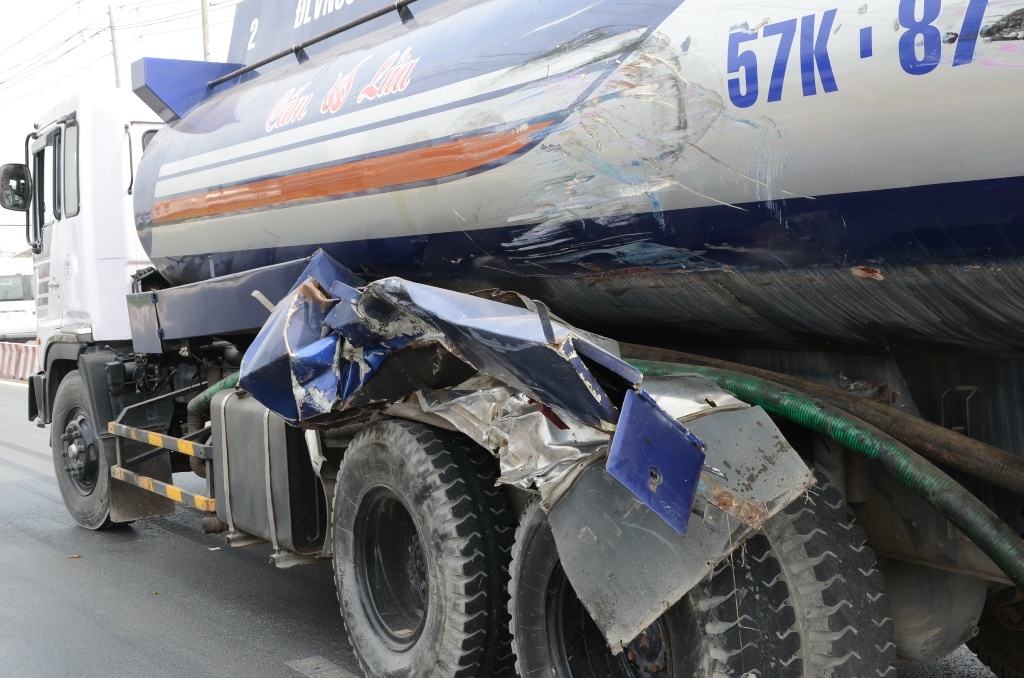 | Chiếc xe bồn gây tai nạn khiến bé trai 1 tuổi rơi từ xe khách xuống đường. |