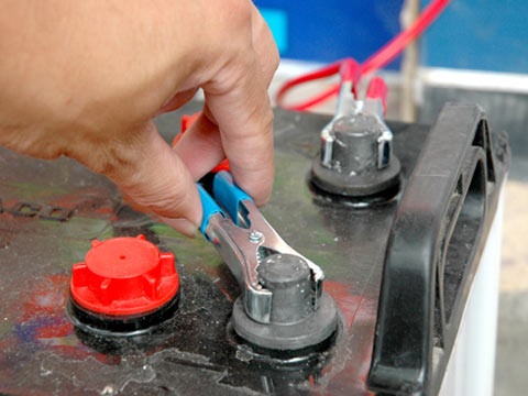 - Nối đầu dây với cực (-) của ắc quy hỗ trợ, đầu còn lại kẹp vào phần kim loại không sơn trên khoang động cơ của xe hết bình ắc quy (chú ý không kẹp vào cực (-) của ắc quy hết điện).