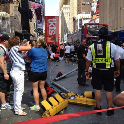 Bức ảnh này cho thấy chiếc xe buýt màu đỏ gần như nằm trên phần đường dành cho người đi bộ ở Quảng trường Thời Đại.