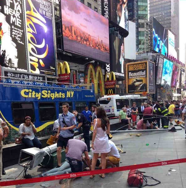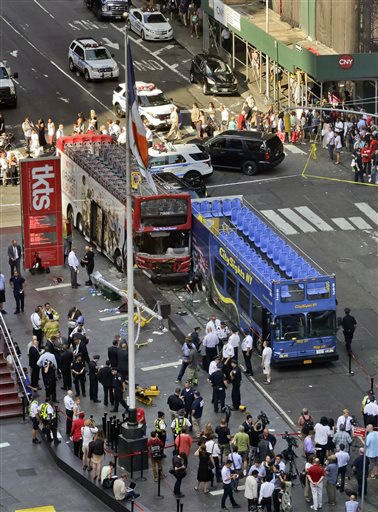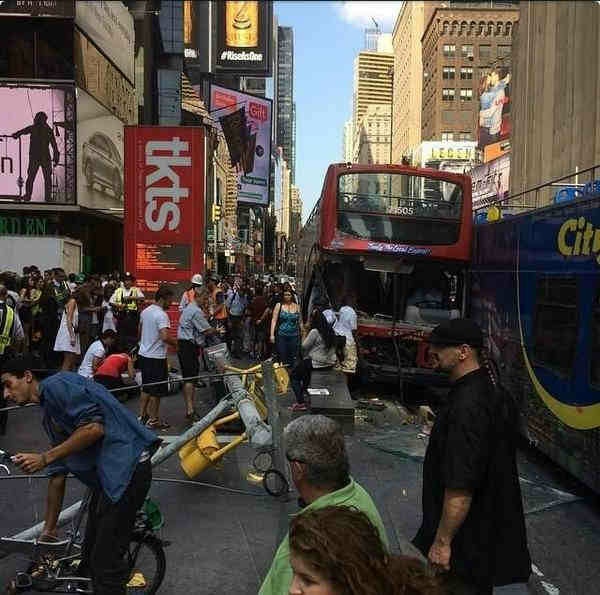 Cảnh sát New York cho biết, hai chiếc xe buýt va chạm trước khi một chiếc húc đổ cột đèn trên Quảng trường Thời đại ở thành phố New York. Sự cố làm 14 người đi bộ và 1 trẻ em trên xe buýt bị thương, CBS đưa tin.