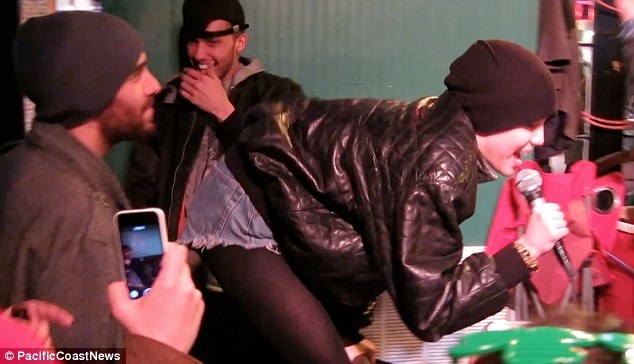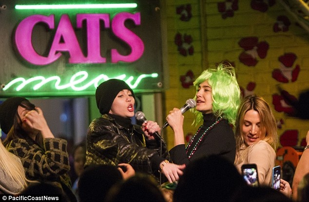 Ngay cả khi ăn mặc kín mít và đi hát karaoke với bạn bè, Miley vẫn không quên những động tác biểu diễn đầy khiêu khích.