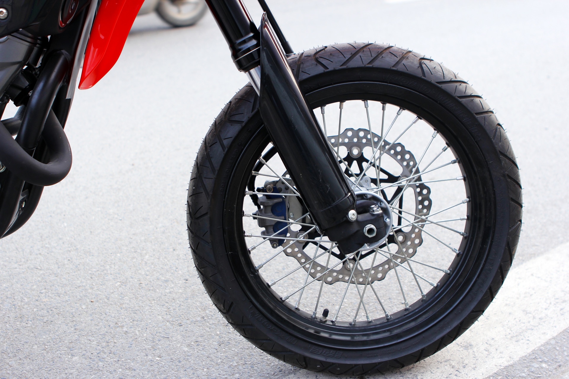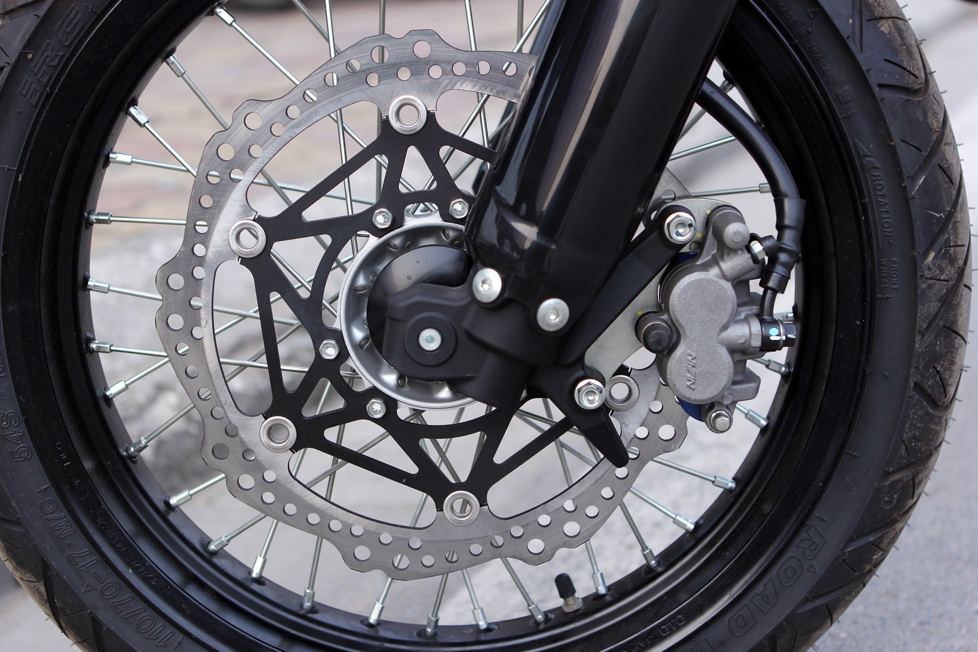 | Trang bị an toàn phía trước là phanh đĩa thủy lực, đường kính 296 mm. Bánh trước kích thước 110-70/17. |