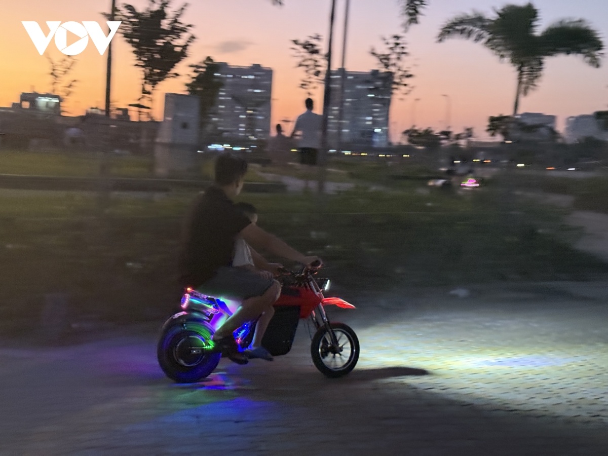 Càng về tối, hoạt động đua xe càng đông đúc và hỗn loạn hơn. Hầu như mọi lối đi nhỏ trong công viên đều biến thành “trường đua” của những chiếc cào cào mini. Việc đua xe diễn ra tự phát, không theo trật tự nào, chủ yếu do các nhóm trẻ em rủ nhau chơi. Nhiều người đi bộ hoảng sợ, phải nép vào lề cao để tránh tai nạn.