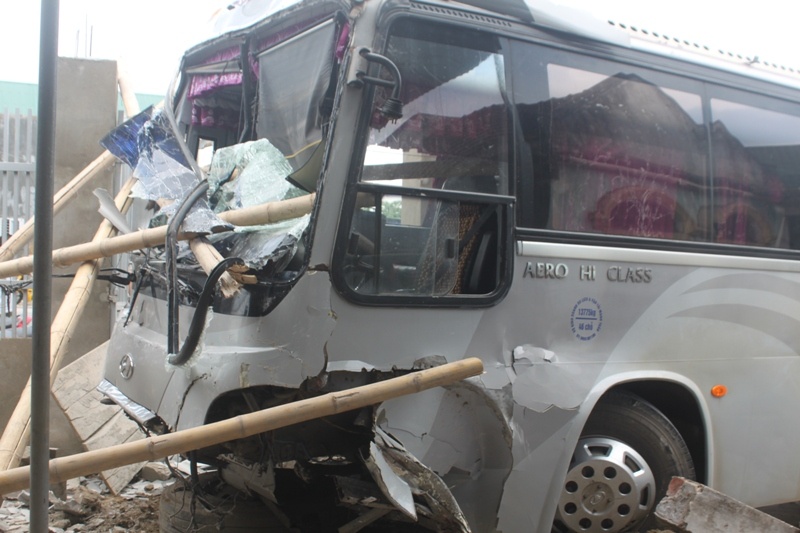 | Chiếc xe khách bị hư hỏng nặng sau khi đâm vào nhà dân. Kính phía trước bị nát bét hoàn toàn. |