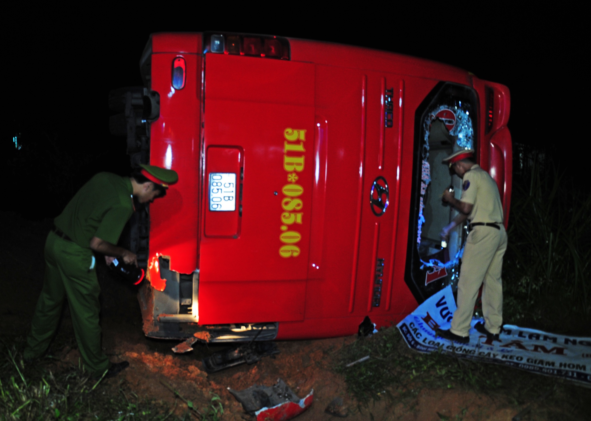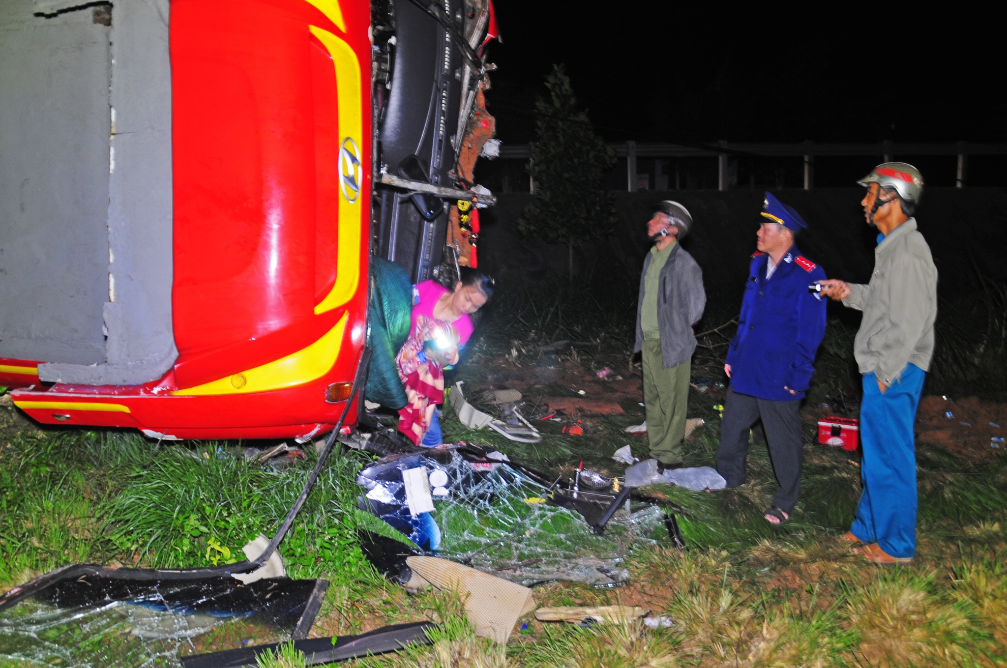| Khoảng 23h ngày 31/1, xe khách giường nằm chở 45 hành khách từ TP HCM về quê Quảng Trị đón tết Bính Thân, đến phía Nam cầu Cháy thuộc địa phận xã Bình Hiệp, huyện Bình Sơn (Quảng Ngãi) thì gặp nạn. Xe này xuất phát từ An Sương (TP HCM) lúc 3h sáng 31/1. |