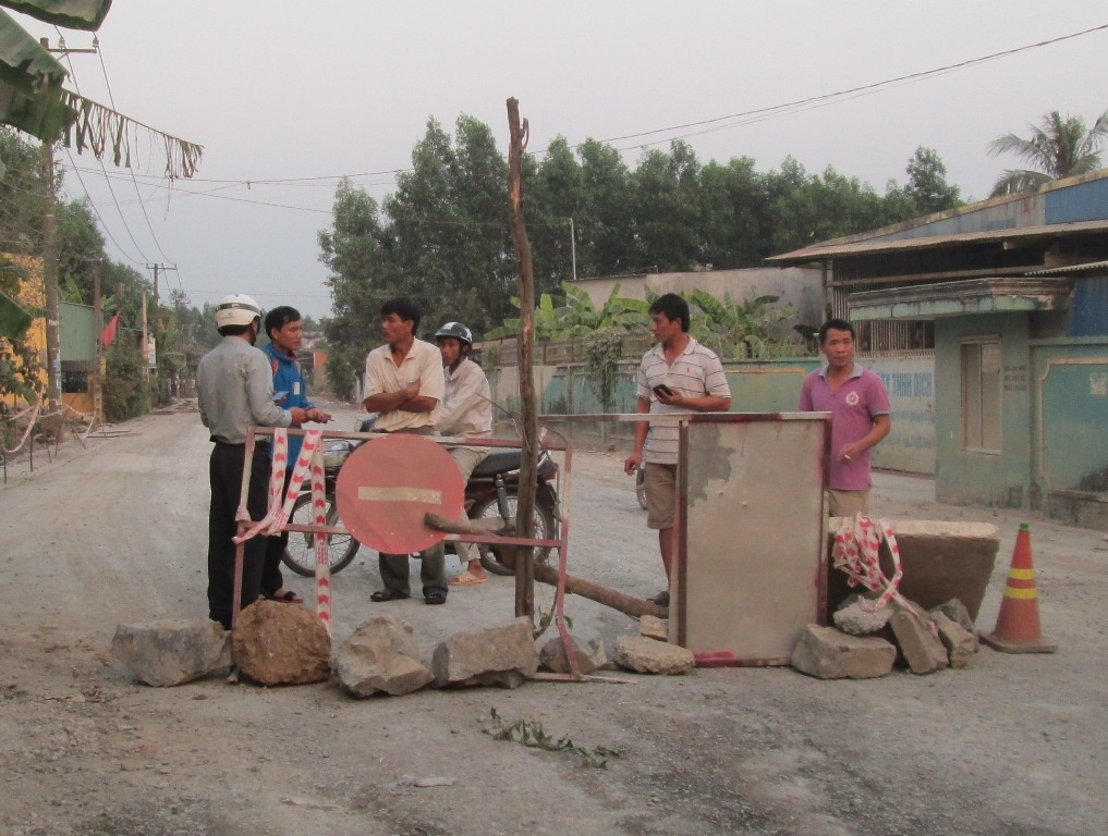 Chiều 26/1, nhiều người dân ở ấp Hương Phước và Tân Cang (xã Phước Tân, TP Biên Hòa, Đồng Nai) dùng đá, gỗ lập hàng rào chặn ngang đường từ quốc lộ 51 vào mỏ đá Tân Cang để ngăn xe tải hoạt động.