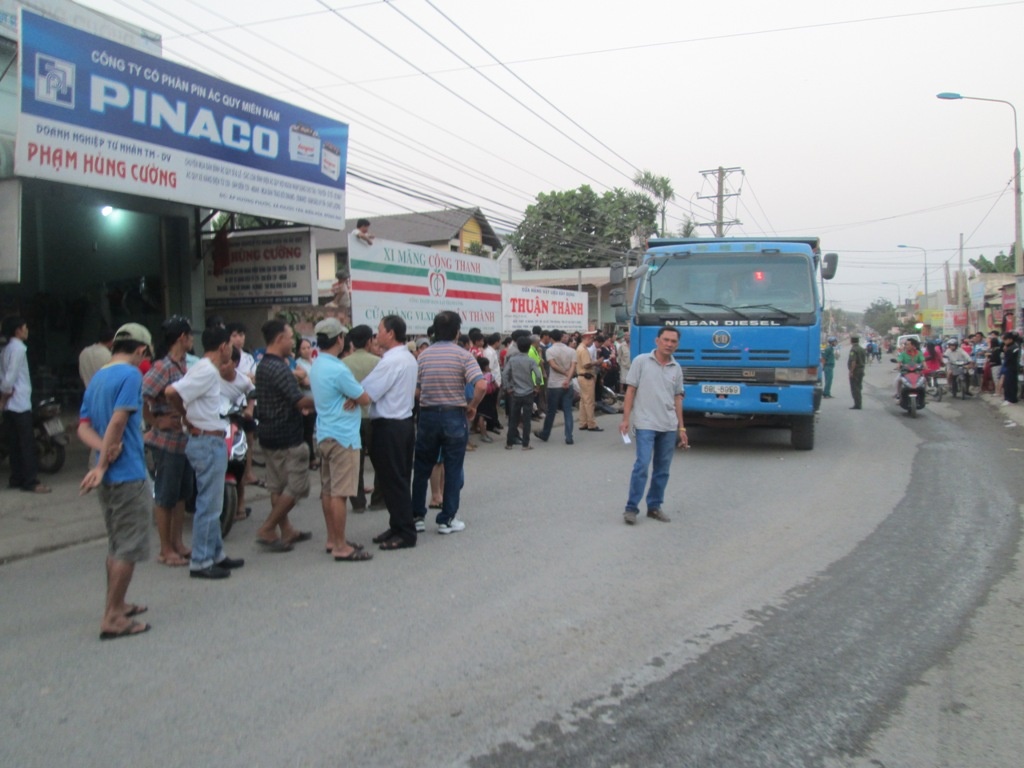 | Người dân đổ ra đường chặn xe tải ra vào mỏ đá Tân Cang (TP Biên Hòa, Đồng Nai). |