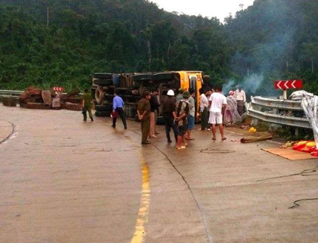 Vào thời điểm trên, xe tải BKS 74C chở đầy gỗ trắc bị lật nghiêng khi đang đổ dốc đèo. Vụ tai nạn khiến anh Nguyễn Viết Hùng (24 tuổi, tài xế) chết tại chỗ, Lê Văn Châu (31 tuổi) tử vong trên đường đi cấp cứu.