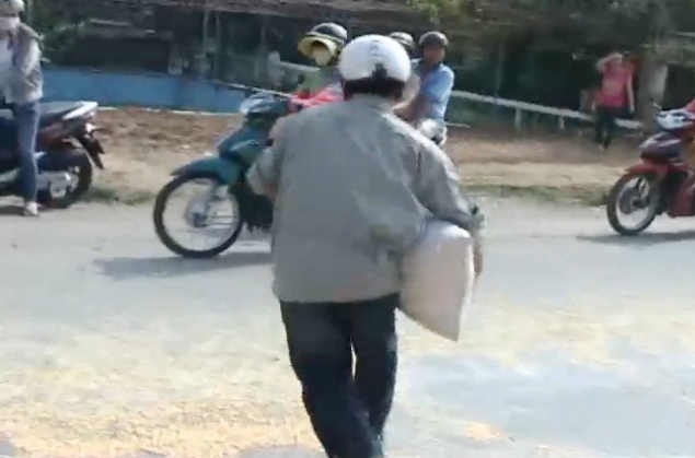| Hơn 1 tấn ngô bị đổ xuống đường, nhiều người đã gom giúp tài xế. |