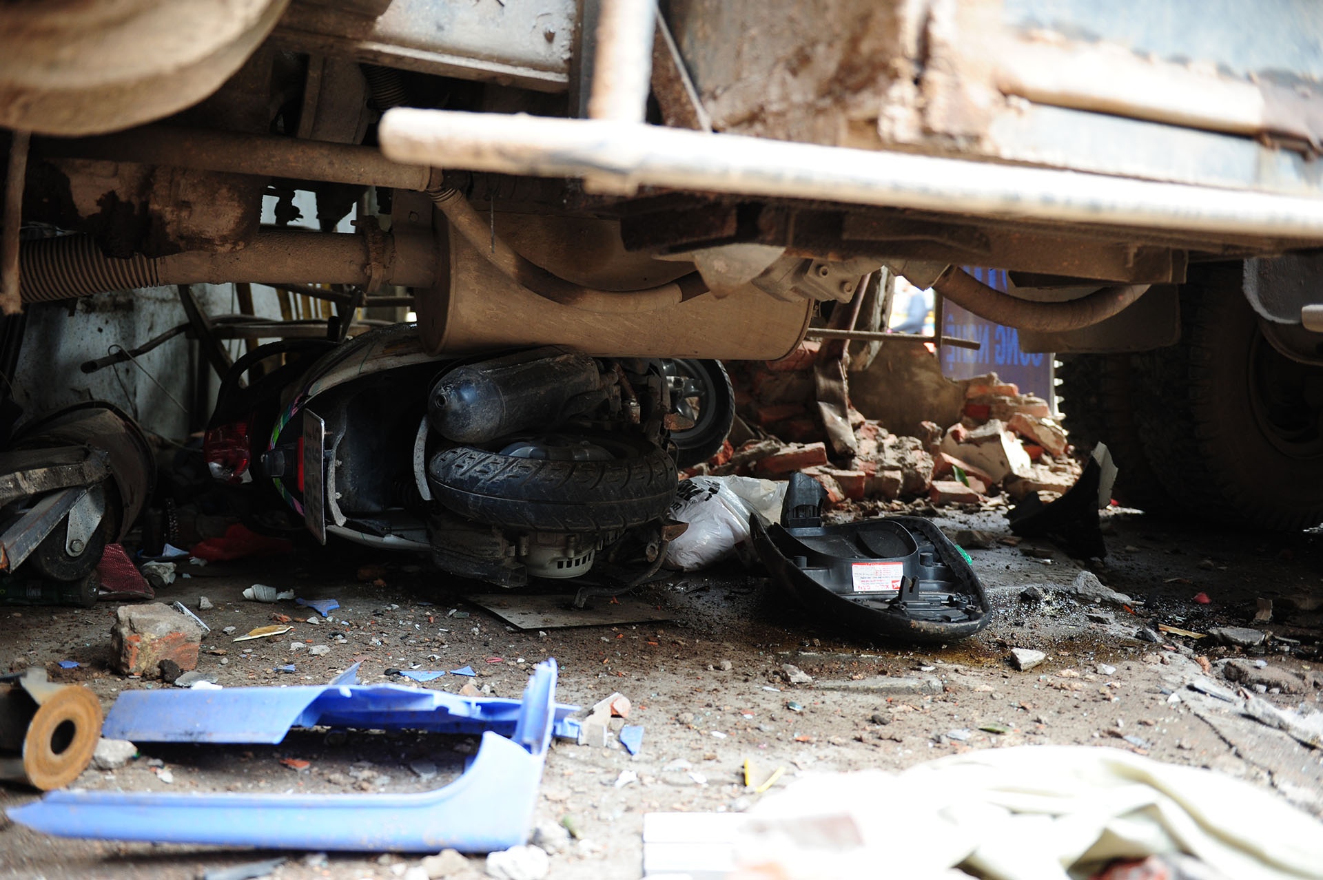 | Hiện trường ngổn ngang và một chiếc xe máy nằm gọn trong gầm xe chở rác. |