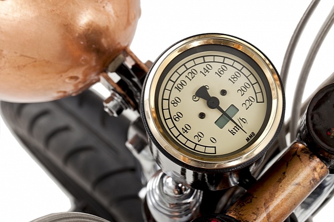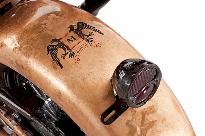 Toàn bộ phần khung xe, đèn pha, chắn bùn, bình xăng và tay lái đều được Telli chế tác từ đồng đỏ, thêm vào đó là yên xe đơn và ống pô hình đuôi cá đạm chất retro. Một điểm đặc biệt nữa là bàn đạp khởi động xe được Tellie làm từ những mắt xích của xe.