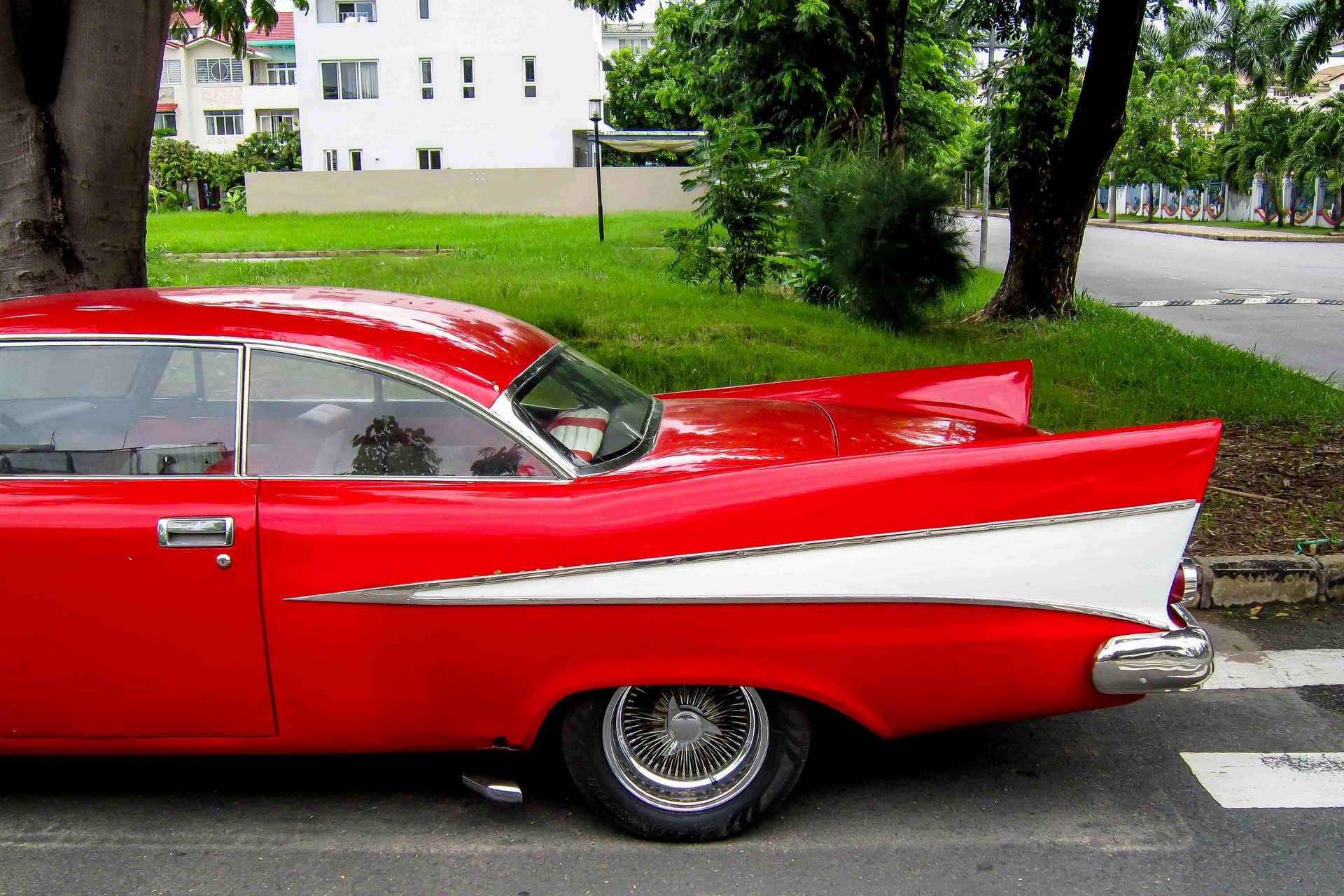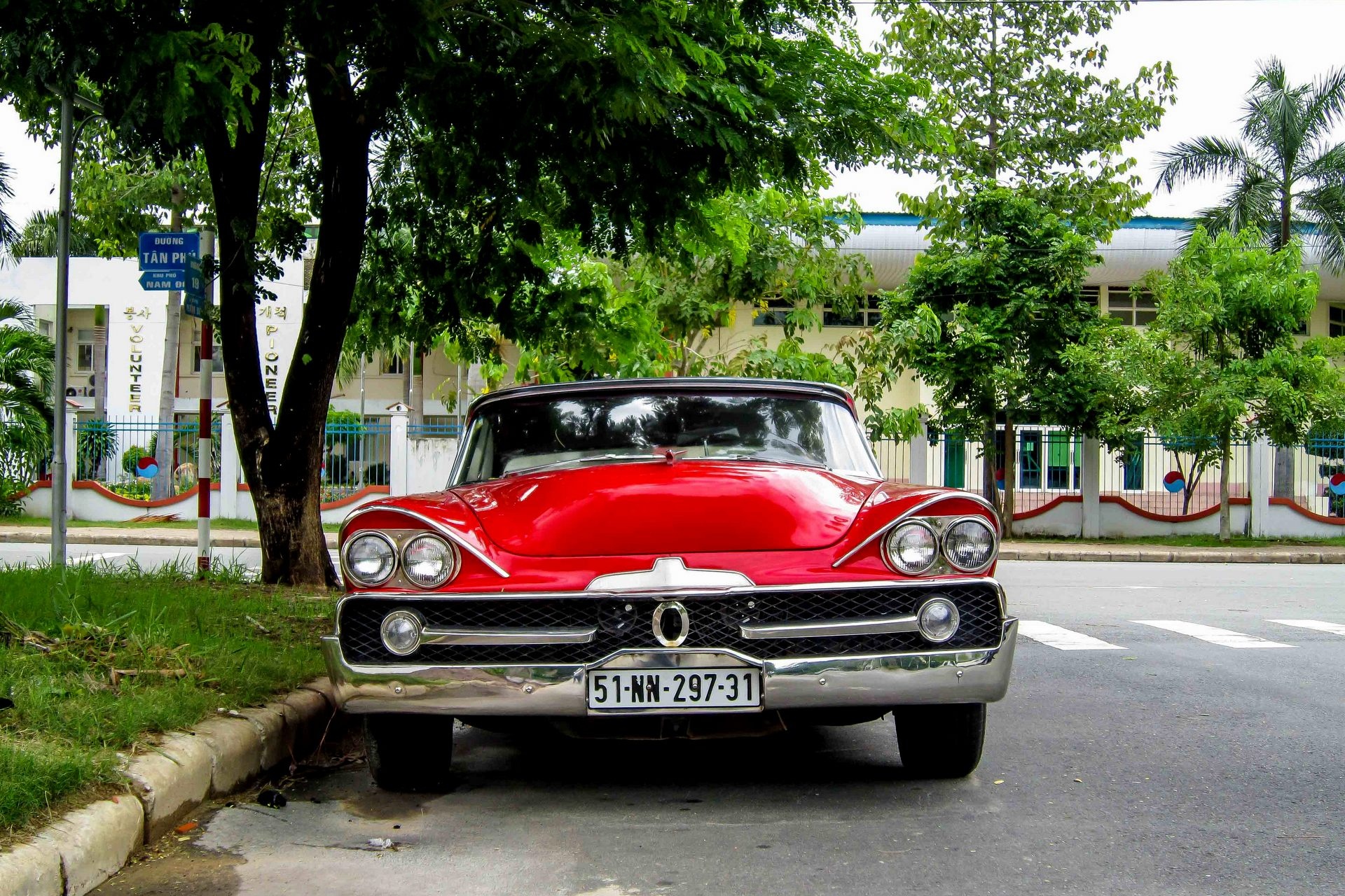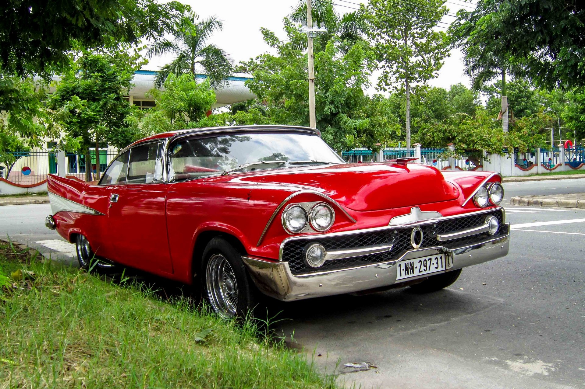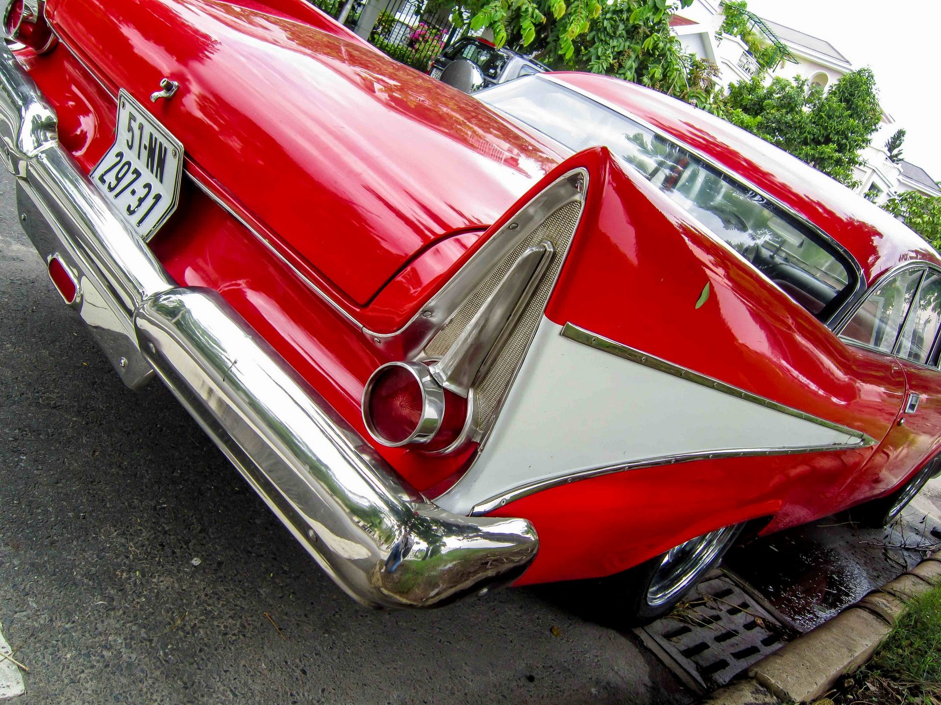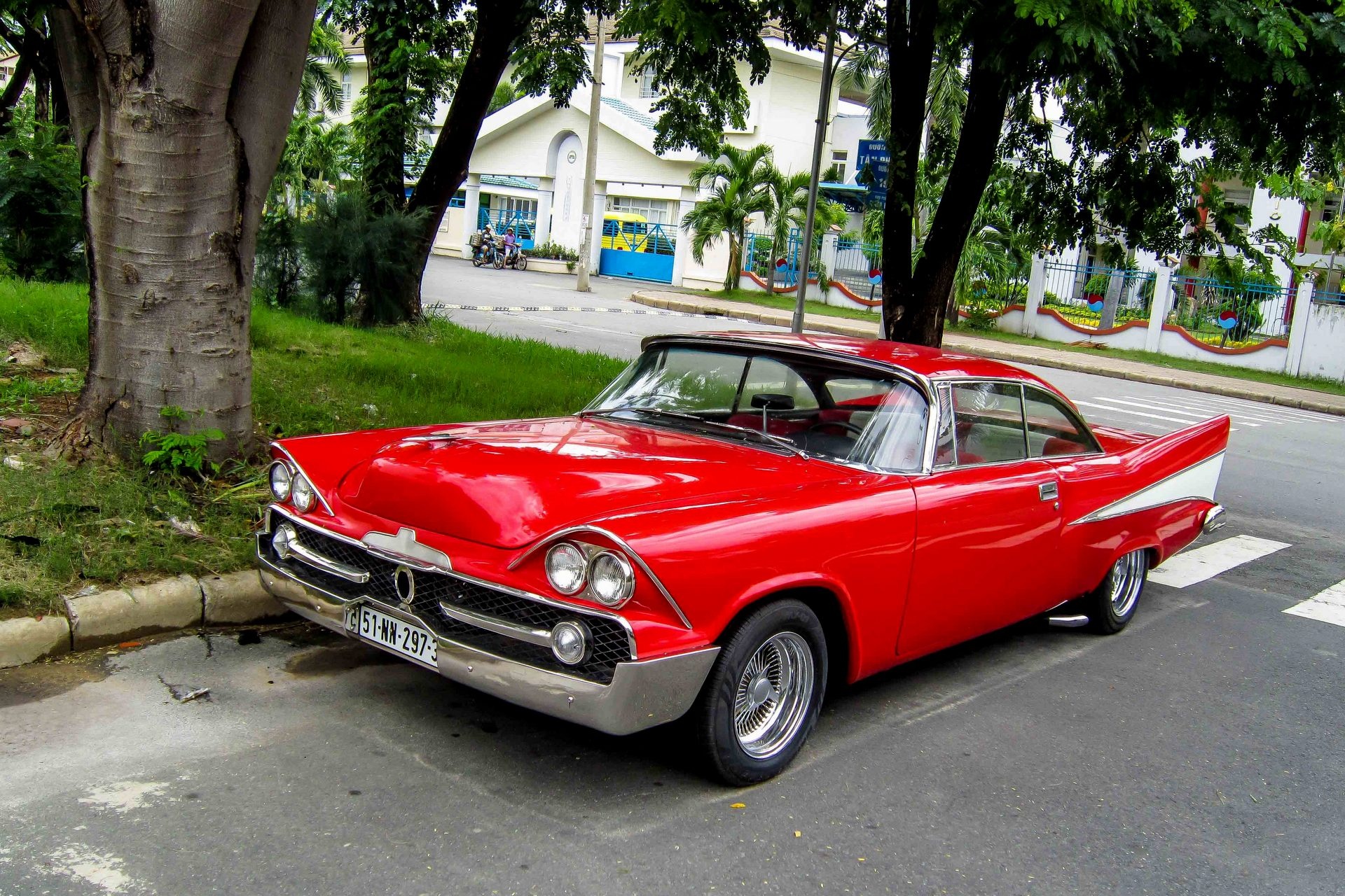 Chiếc Dodge Mayfair đời 1958 được một người chơi xe tại TP HCM tân trang lại khá mới, nổi bật với cản mạ chrome bóng loáng cùng màu sơn đỏ.
