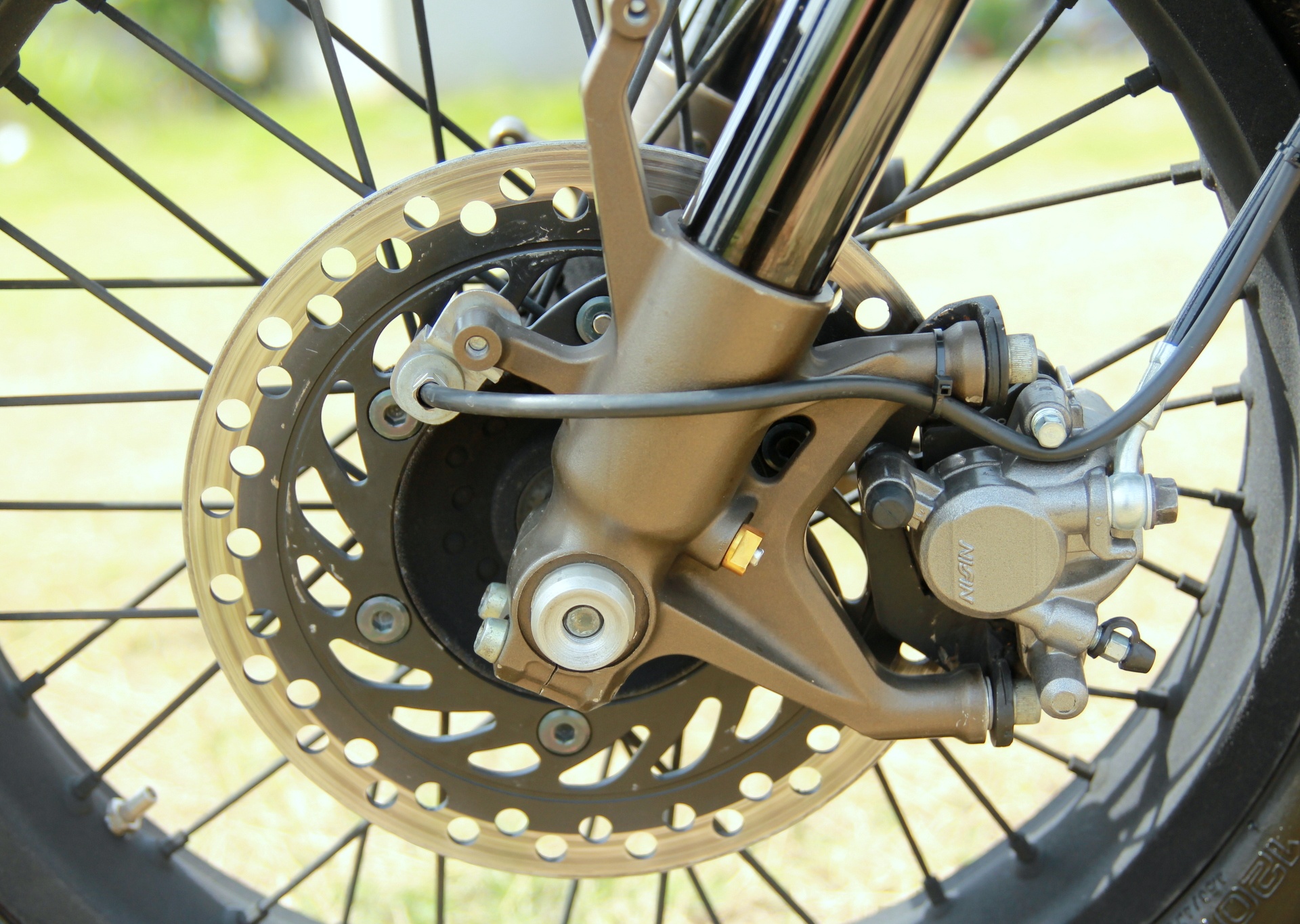 | Phanh đĩa đơn phía trước lắp heo dầu Nissin với pat gắn heo dầu được chế lại. |