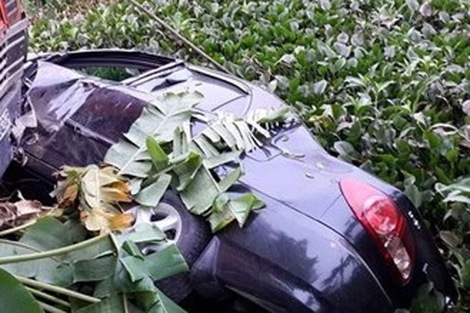 Cú va chạm mạnh khiến chiếc xe biển xanh lao đi hàng chục mét rồi lao xuống ao bèo sát vệ đường. Rất may các cán bộ trên ôtô này chỉ bị thương.