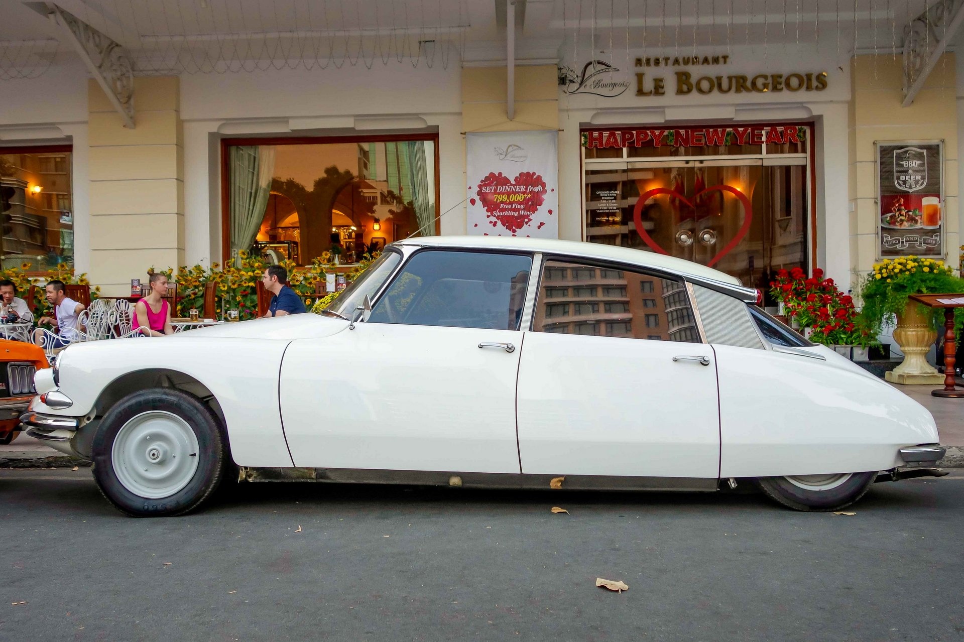 | Một chiếc Citroen DS khác được sơn màu trắng trang nhã. Tuy nhiên đa phần xe Citroen ở Việt Nam được phục dựng, rất hiếm xe còn giữ được nguyên bản. |