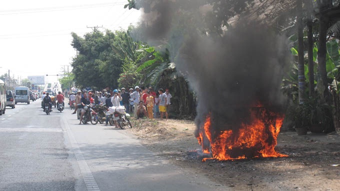 | Lửa và khói đen bốc cao trong sự hiếu kỳ của dân địa phương. |