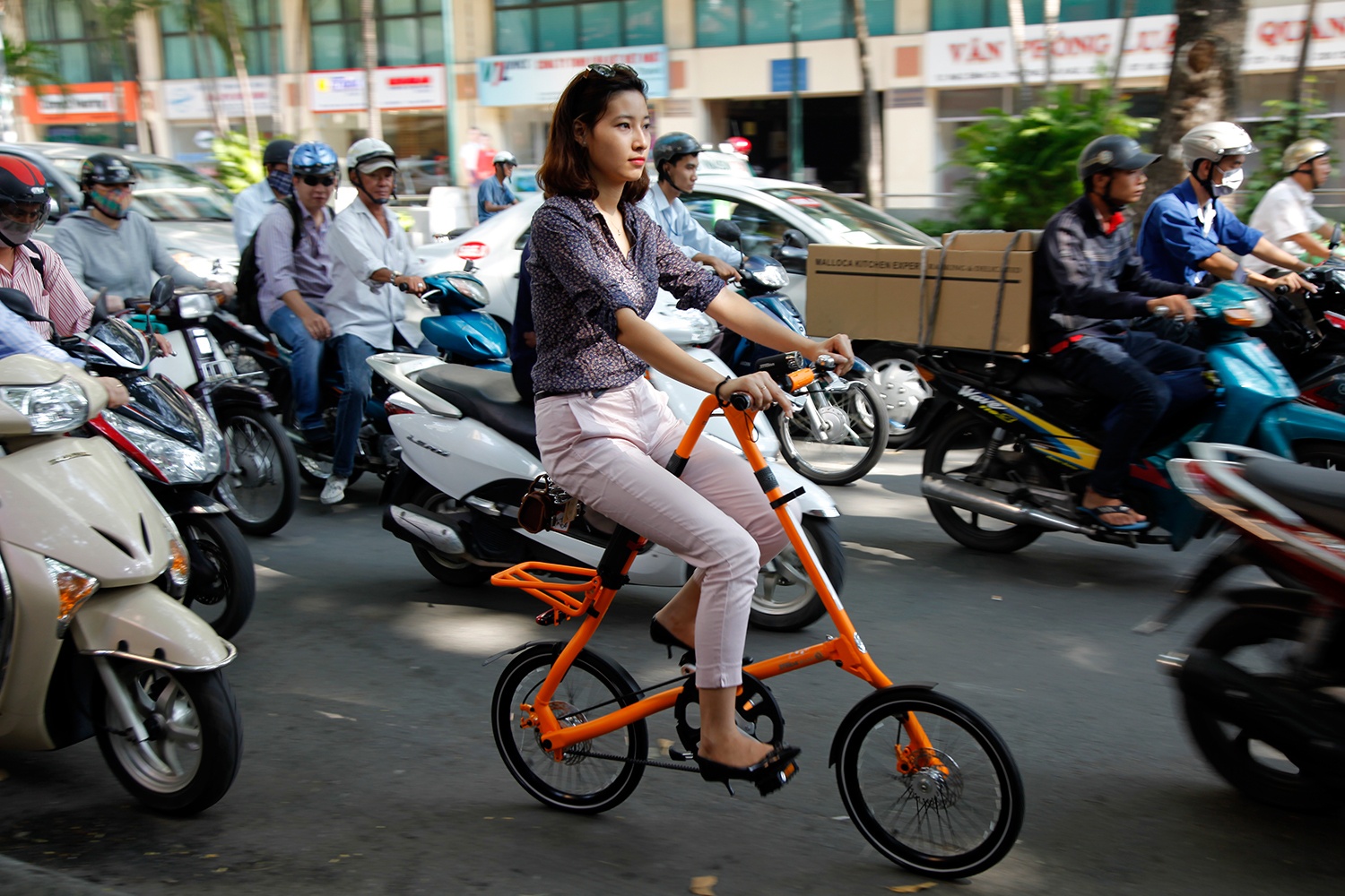 Chị Hân chủ sở hữu chiếc xe cho biết, chọn xe đạp gấp làm phương tiện đi làm hàng ngày vì phù hợp với giao thông phức tạp như ở Sài Gòn. Đây là dòng xe nhập ngoại nên có giá hơi đắt, khoảng 1.300 USD. |