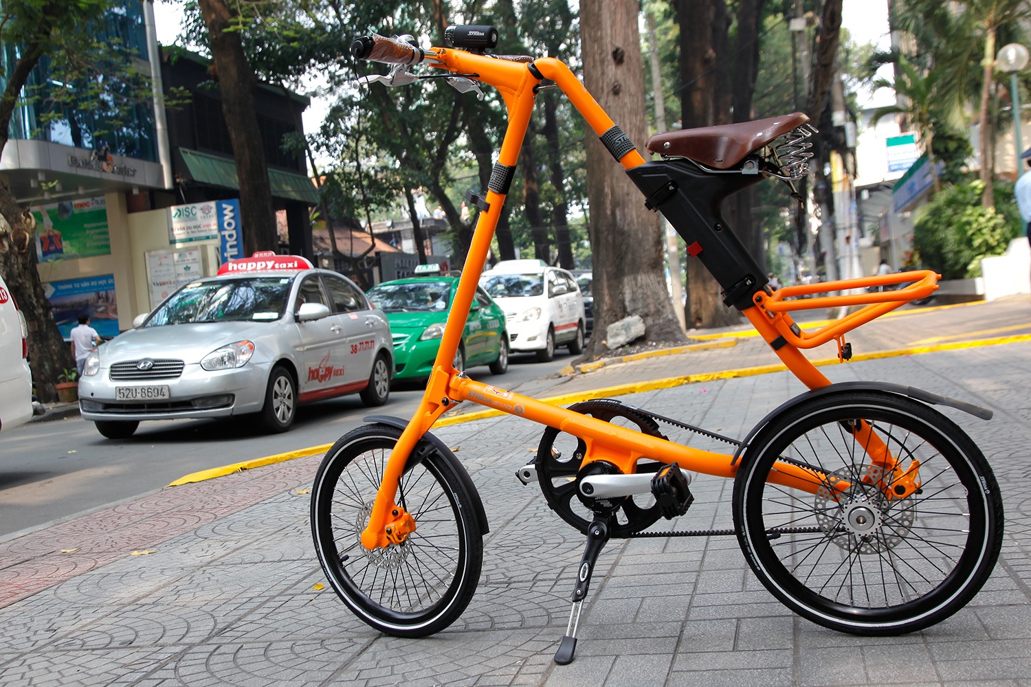 Chiếc xe đạp lạ này thu hút sự chú ý của nhiều người khi xuất hiện trên đường phố Sài Gòn. Xe được thiết kế hình tam giác khá lạ mắt, màu sắc nổi bật.Tuy có kiểu dáng khác lạ nhưng việc điều khiển chiếc xe này trông rất nhẹ nhàng.