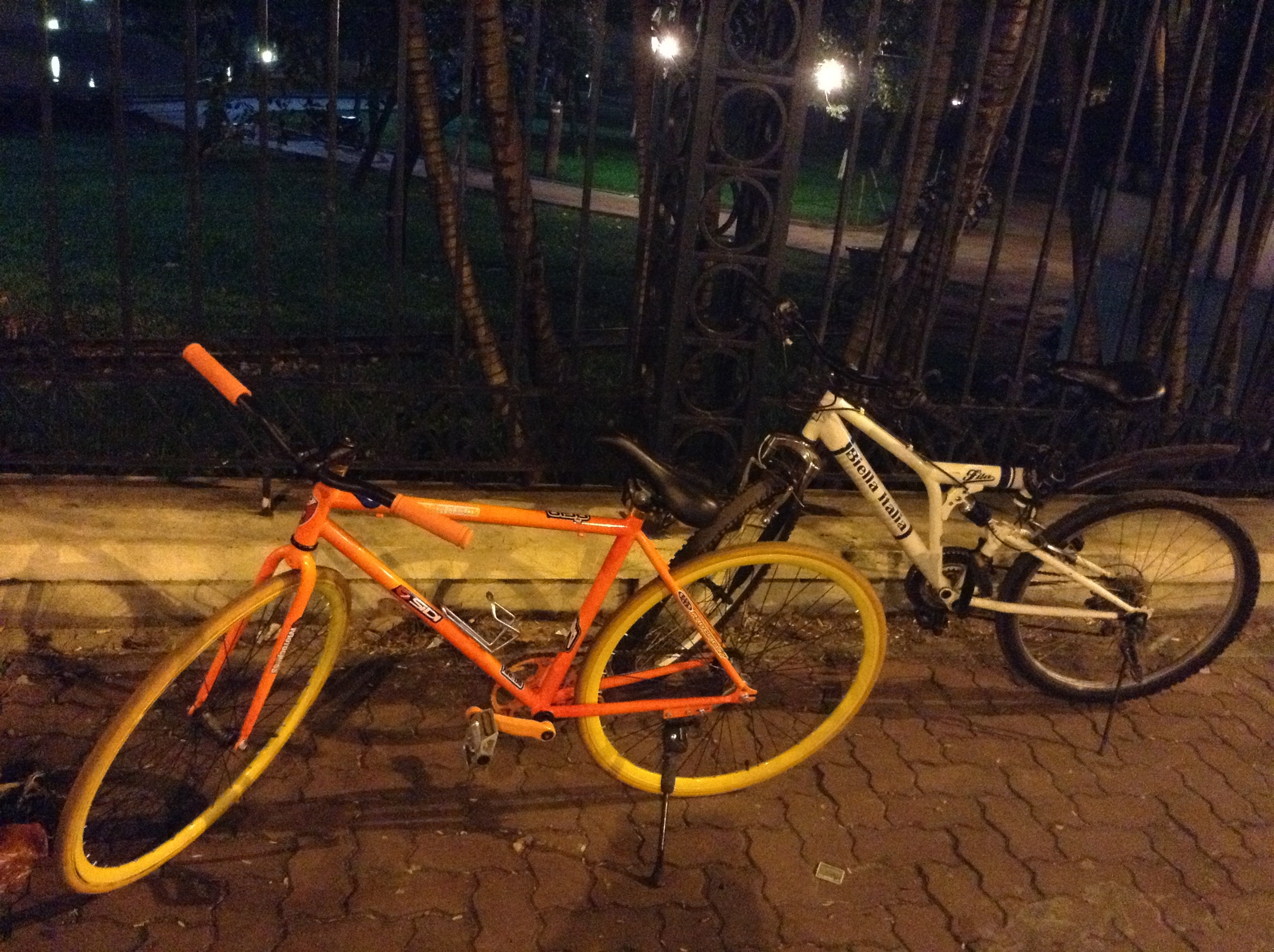 | Hoàng, chủ nhiệm một câu lạc bộ xe đạp Fixie ở Hà Nội sở hữu 2 xe đạp không phanh với màu sắc và kiểu dáng khác nhau. |