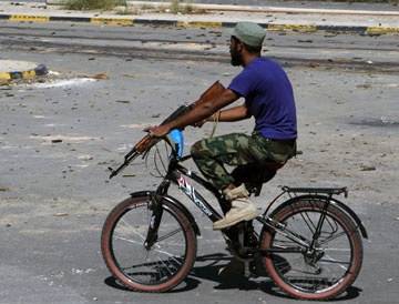 Một người lính mang theo khẩu AK-47 đang tuần tra trên đường phố Sirte, Libya. Anh này cho biết luôn cảm thấy mát mẻ, tĩnh lặng và thoải mái khi điều khiển chiếc xe hai bánh thay vì những loại xe cồng kềnh khác. Ảnh: Reuters