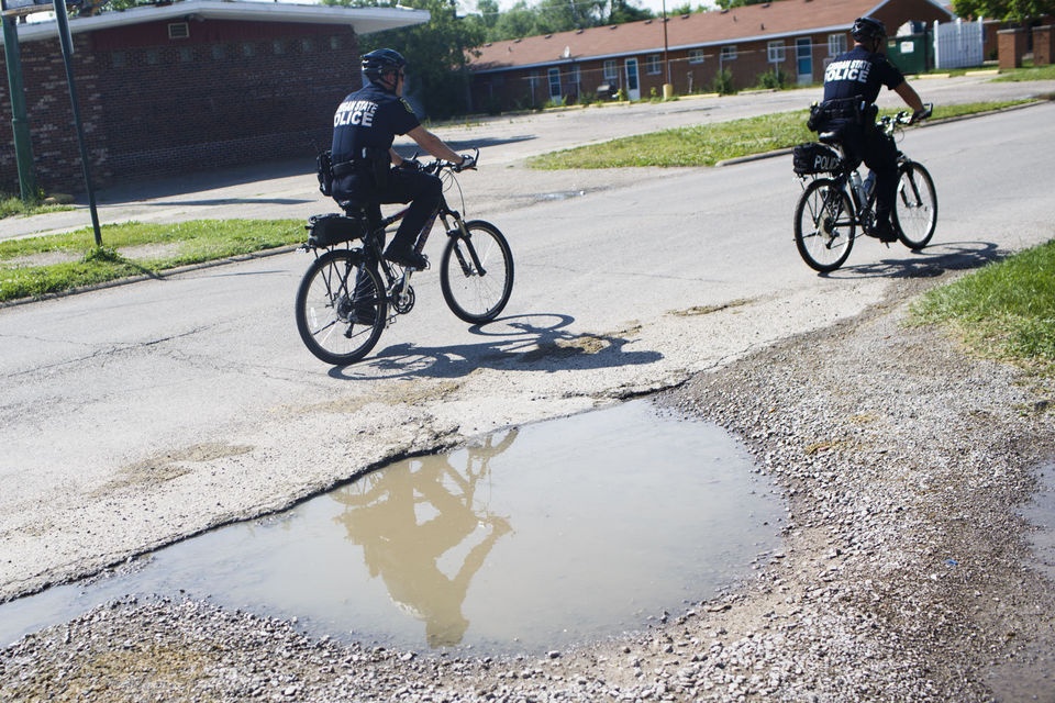 | Cảnh sát bang Michigan, Mỹ, sử dụng xe đạp để tuần tra tại khu vực có nhiều tội phạm thuộc thành phố Flint, hạt Genesee. Lực lượng chức năng đi kiểm tra an ninh khu vực vào cả ngày và đêm với khoảng 20 giờ một ngày. Giới chức bang tin rằng, đi tuần bằng xe đạp sẽ giúp cảnh sát gần gũi hơn với người dân và tăng sự hiện diện của họ tại khu vực. Ảnh: Mlive.com |