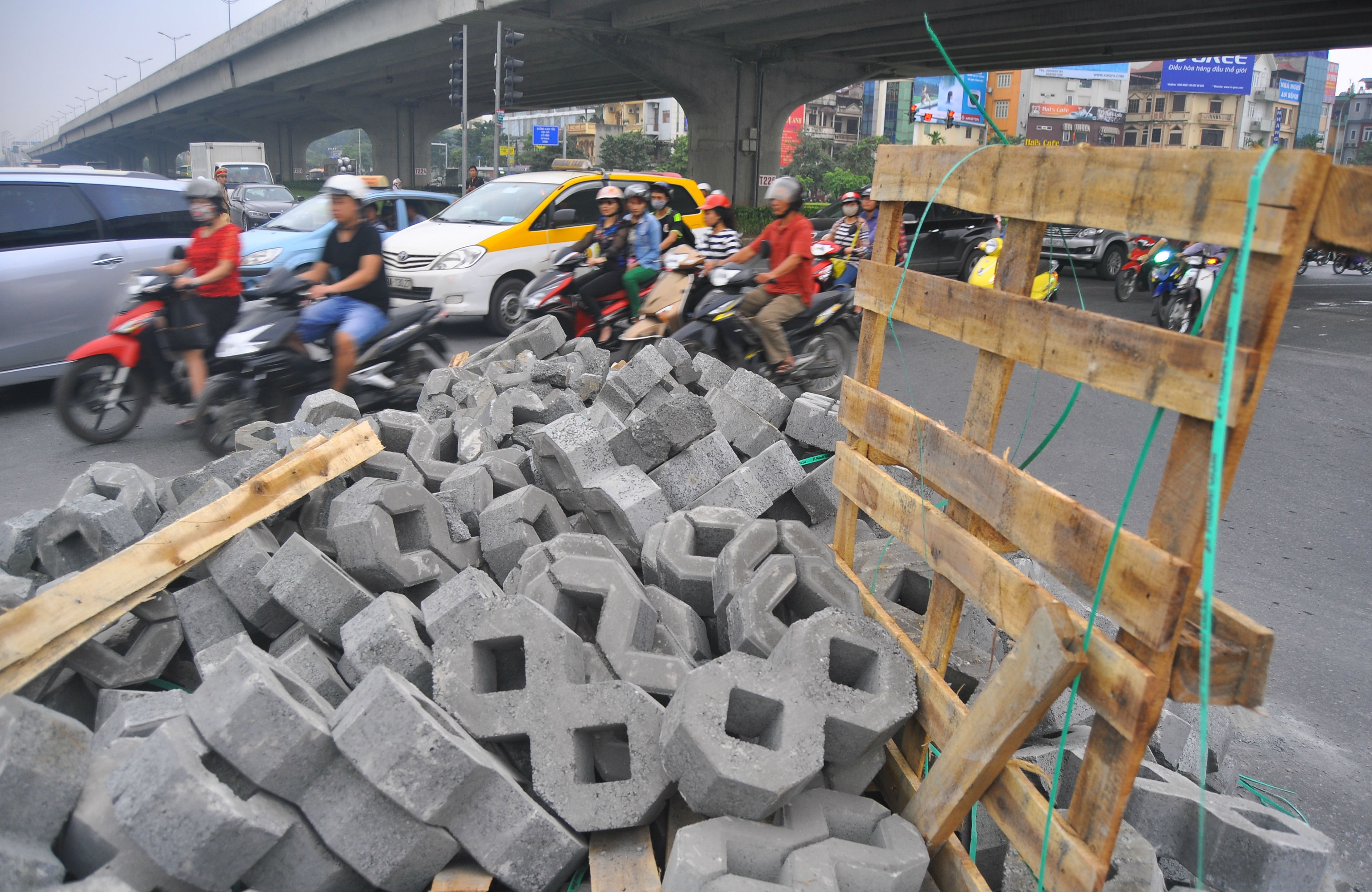 | Tại hiện trường, số vật liệu bị rơi xuống lòng đường chiếm điện tích khoảng 30 m2 chắn một phần lòng đường tại nút giao thông này. Ước tính, có hàng ngàn viên gạch lát nền rơi. |