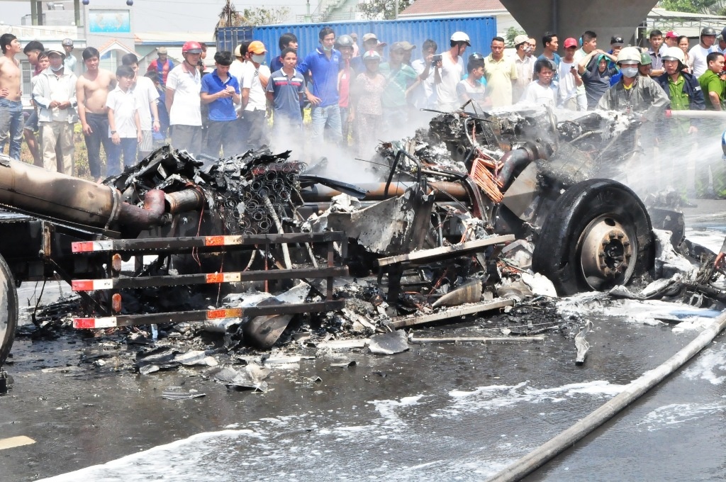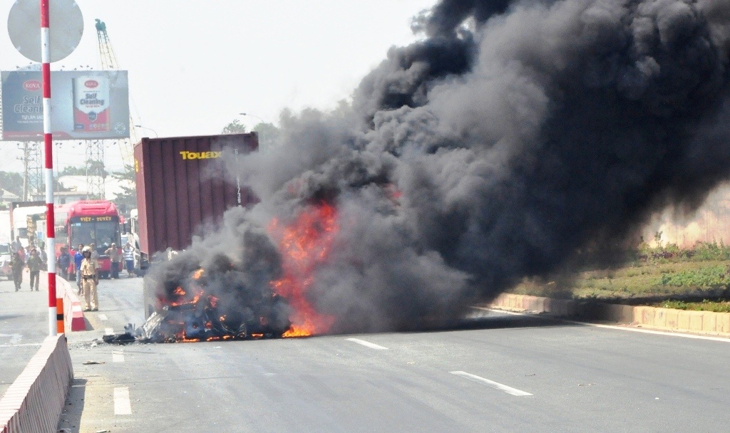 | Nhiều người xung quanh mang bình chữa cháy chạy đến nhưng ngọn lửa lan quá nhanh, bao trùm đầu xe nên không thể dập tắt. Lực lượng PCCC quận 9 điều 2 xe chữa cháy chuyên dụng, tỉnh Bình Dương và tỉnh Đồng Nai cũng điều động lực lượng đến tiếp viện. |