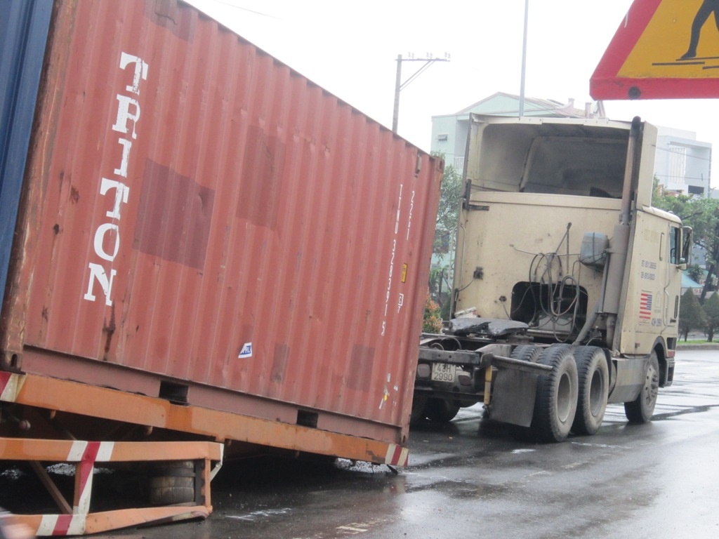 | Hiện trường vụ xe đầu kéo gãy cầu nối làm rơi rơmooc và thùng hàng container. |