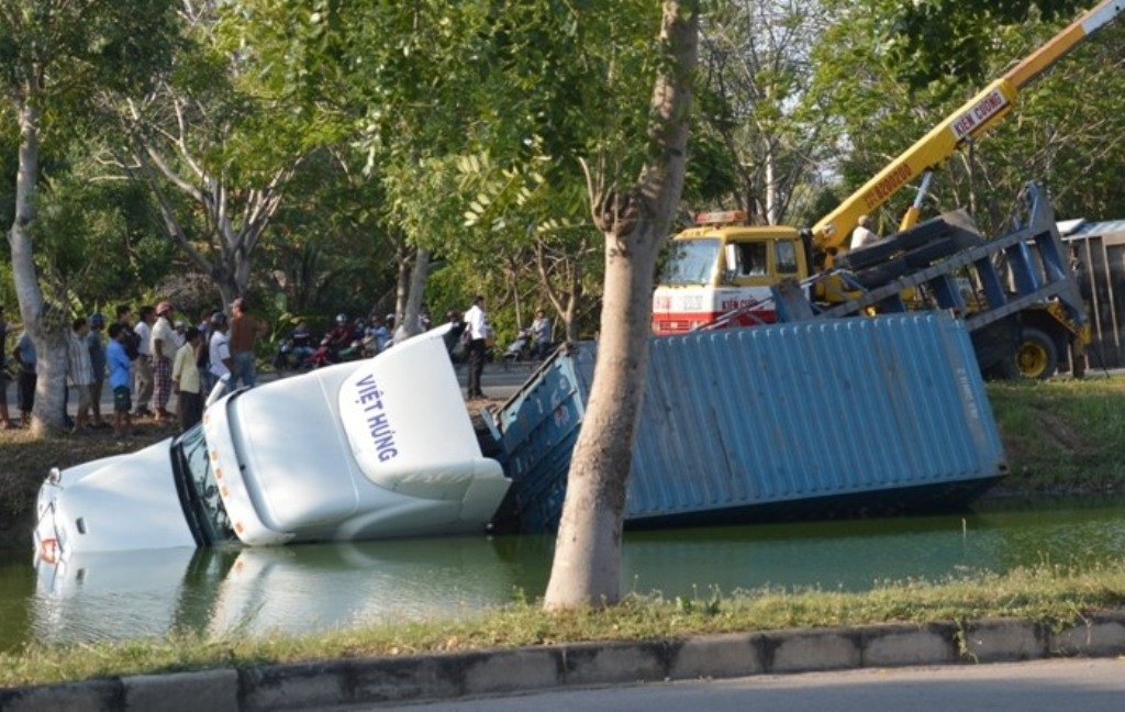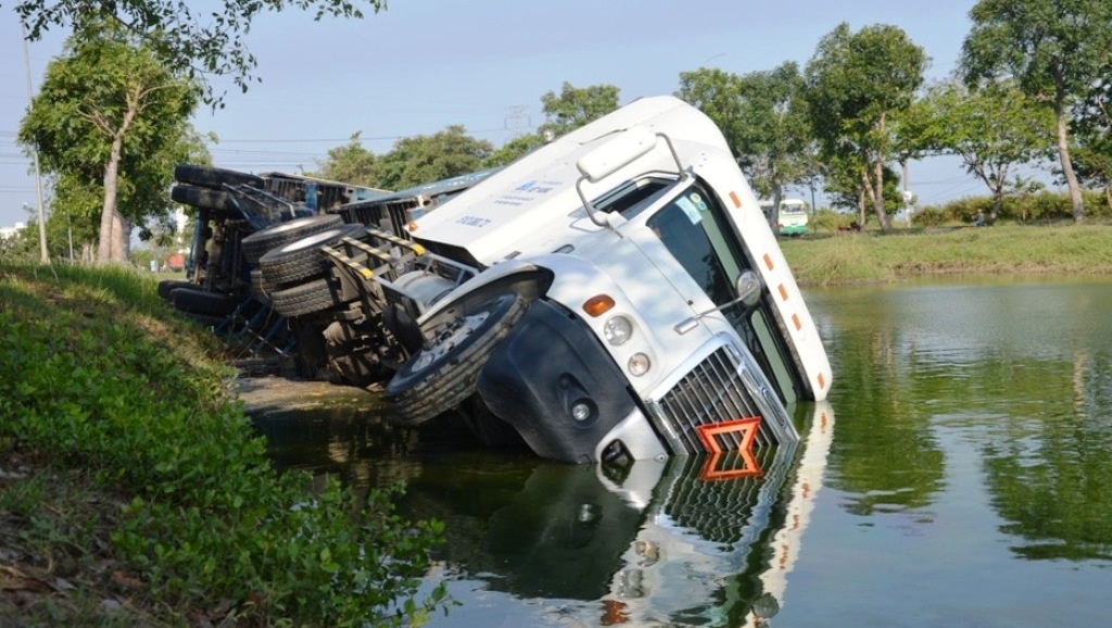 Do không có vật cản nên chiếc xe lao thẳng xuống ao bên đại lộ. May mắn ao này khá cạn nên chiếc xe chỉ bị ngập gần nửa thân. Tài xế phải đạp cửa thoát ra ngoài rồi bơi vào bờ. |