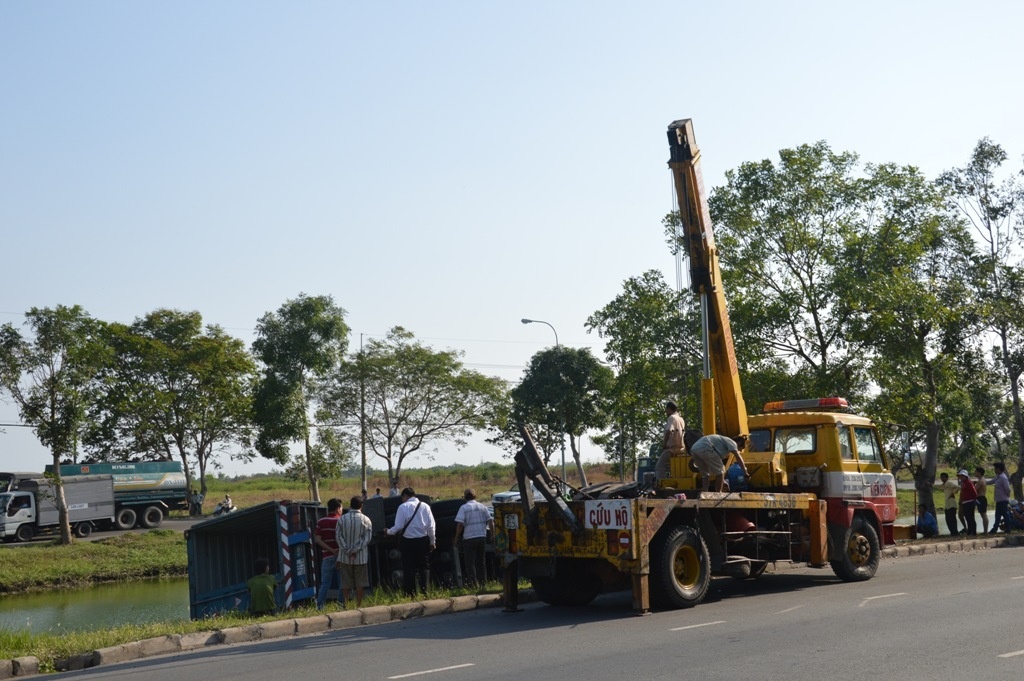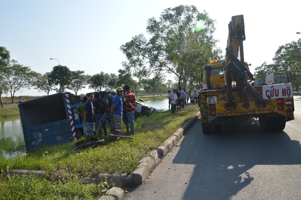 Lực lượng CSGT huyện Bình Chánh đến lập biên bản vụ việc. Đến hơn 17h, chiếc xe đầu kéo vẫn chưa được di dời khỏi đoạn ao gặp nạn. |