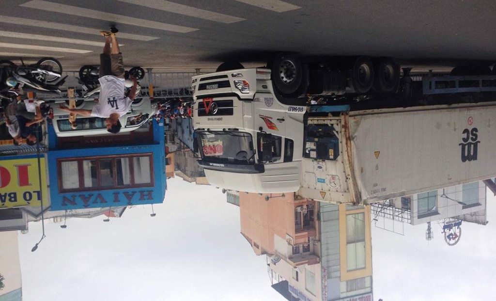 Lúc này, một xe đầu kéo container 40 feet lưu thông phía sau, gặp tình huống bất ngờ nên tài xế đánh lái mạnh qua trái để tránh. Tuy nhiên, do chiều cao vượt quá giới hạn nên container mắc kẹt dưới gầm cầu.