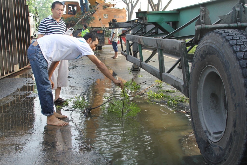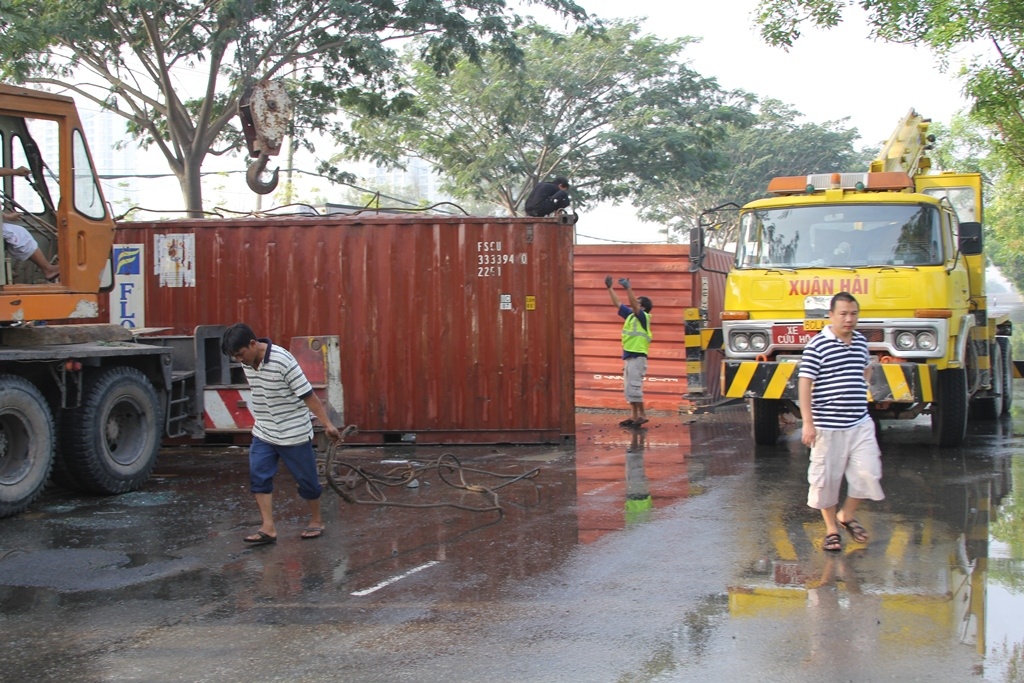 Khi qua khỏi cầu Mã Voi được khoảng 100m thì gặp một đoạn đường ngập nước, anh Dũng cho xe băng qua khoảng được vài chục mét thì bất ngờ rơmooc phát ra tiếng động ầm ầm khiến xe mất thăng bằng rồi lật chắn ngang đường.