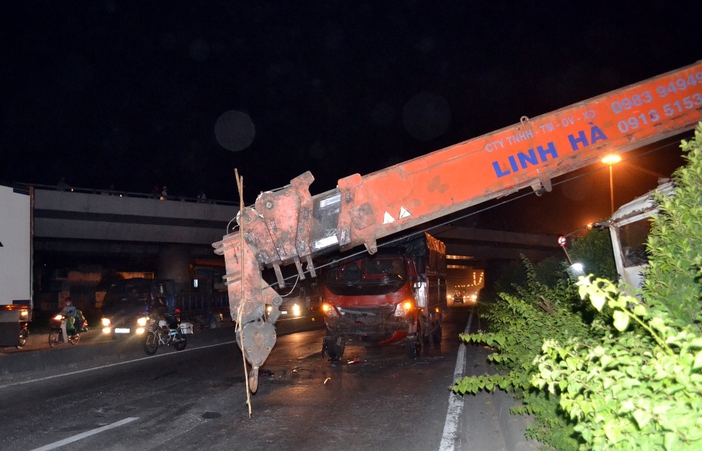 | Cú tông khiến xe tải cẩu bị đổi hướng, phần cần cẩu quay sang hướng ngược chiều, đập vào 2 xe tải và một taxi 7 chỗ đang lưu thông từ ngã tư An Sương về Suối Tiên. May mắn những chủ phương tiện trên kịp thời xử lý nên thoát nạn. |