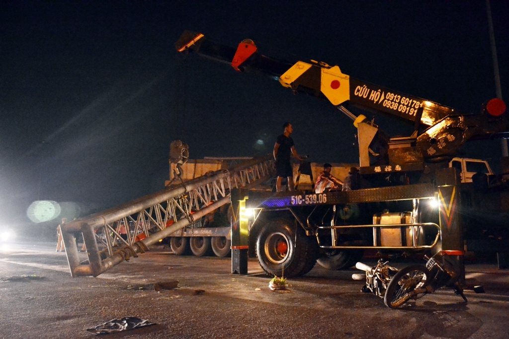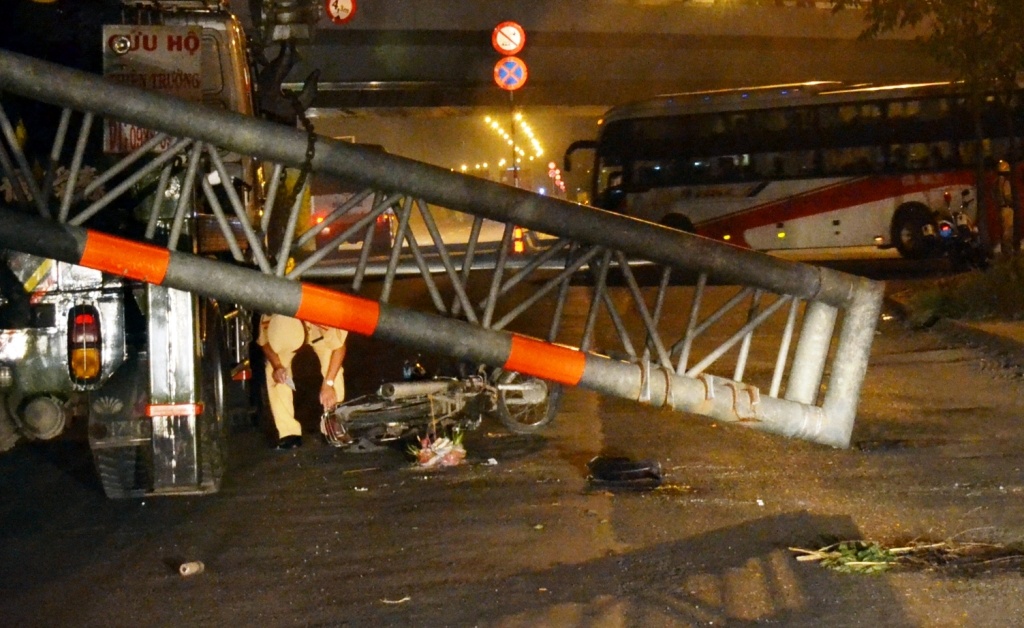 | Vụ tai nạn xảy ra lúc 2h30 ngày 8/9 trên quốc lộ 1A, đoạn gần cầu vượt Quang Trung, quận 12, TP HCM. Nạn nhân là ông Trần Văn Lớp (52 tuổi, quê Bến Tre) bị khung sắt đập trúng khi đang điều khiển xe máy. |