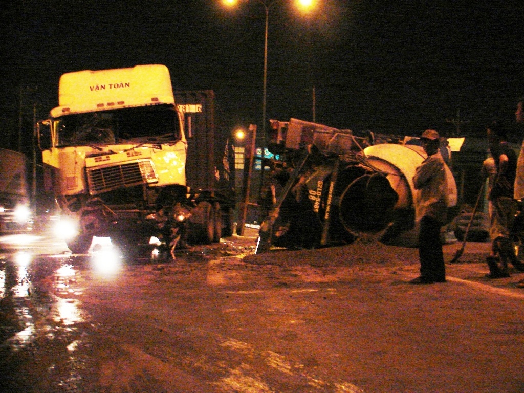 Cú tông bất ngờ và rất mạnh khiến cả 2 tài xế bị thương nặng, được người dân đưa đi cấp cứu. Xe bồn lật chắn ngang đường bị hư hỏng, nhiều tấn bê tông và hàng chục lít dầu đổ tràn ra đường.