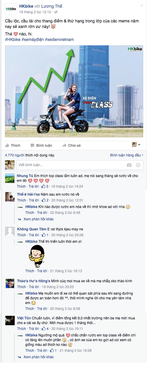 Bởi thế, trên fangape Facebook của hãng xe điện Hkbike, nhiều bạn trẻ rất hào hứng khen ngợi chiếc xe này.